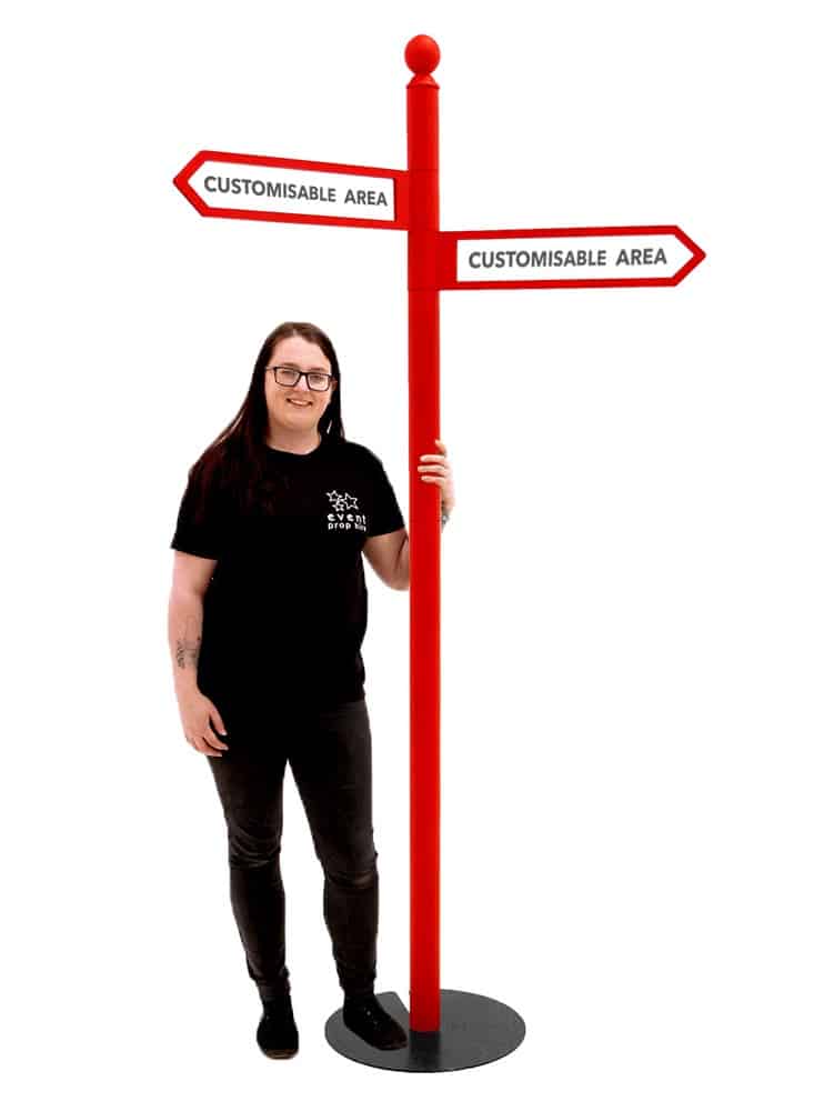 Red Multi-Directional Sign Post to hire. This signpost is very cleverly designed so that the directional arms can be rotated to point in different directions; allowing you full flexibility to highlight different ย locations within your themed event. Also available with just 2 or 6 rotating signs and in other colours. The cost quoted includes the ย customisation ย of the ย double-sided directional arms. This consists of a vinyl print on foamex which simply slips into the frame of the directional arm. We can create the customised artwork for your event. We have a highly skilled team of graphic designers who can help you with the customisation of our directional signposts. We can design customised graphics to suit your event theme. ย Contact us for more details. ย Alternatively you can customise this product yourself then we can take care of the printing for you, we just need your artwork. Alternatively you can customise this product yourself then we can take care of the printing for you, we just need your artwork.