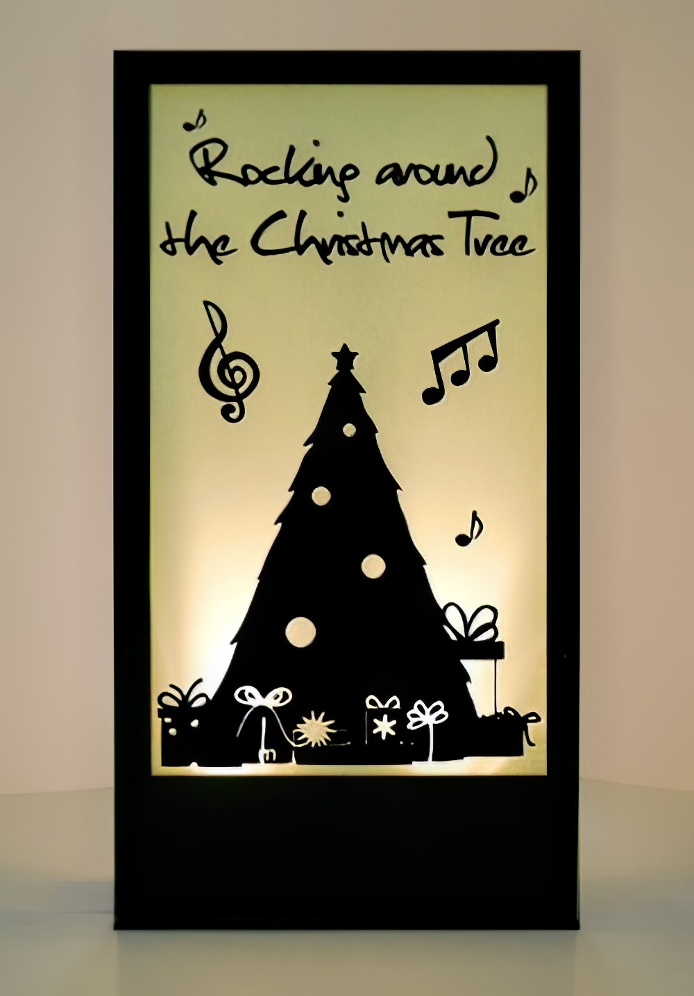 Rocking Around the Christmas Tree Silhouette Panel to hire. This freestanding lit silhouette panel will light up any Christmas party themed event. Actual lighting colour may vary from that depicted.