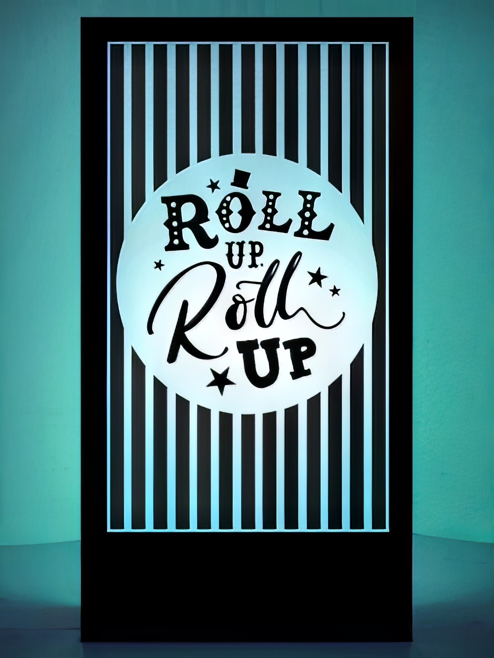 Roll Up Roll Up Silhouette Panel to hire. This silhouette panel is one in a series of Circus themed silhouette panels (below & opposite) and, along with some of our other Circus themed props, are perfect for any Circus themed party or event. All of our silhouette panels come supplied with a colour changing light.