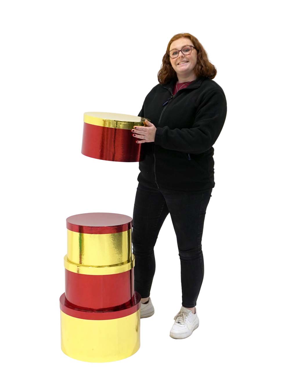 Round Present Boxes – Red/Gold – (Set of 4) for hire Perfect for pretending you got more gifts than you did! Pop them under our dressed Christmas trees for the ultimate festive look!