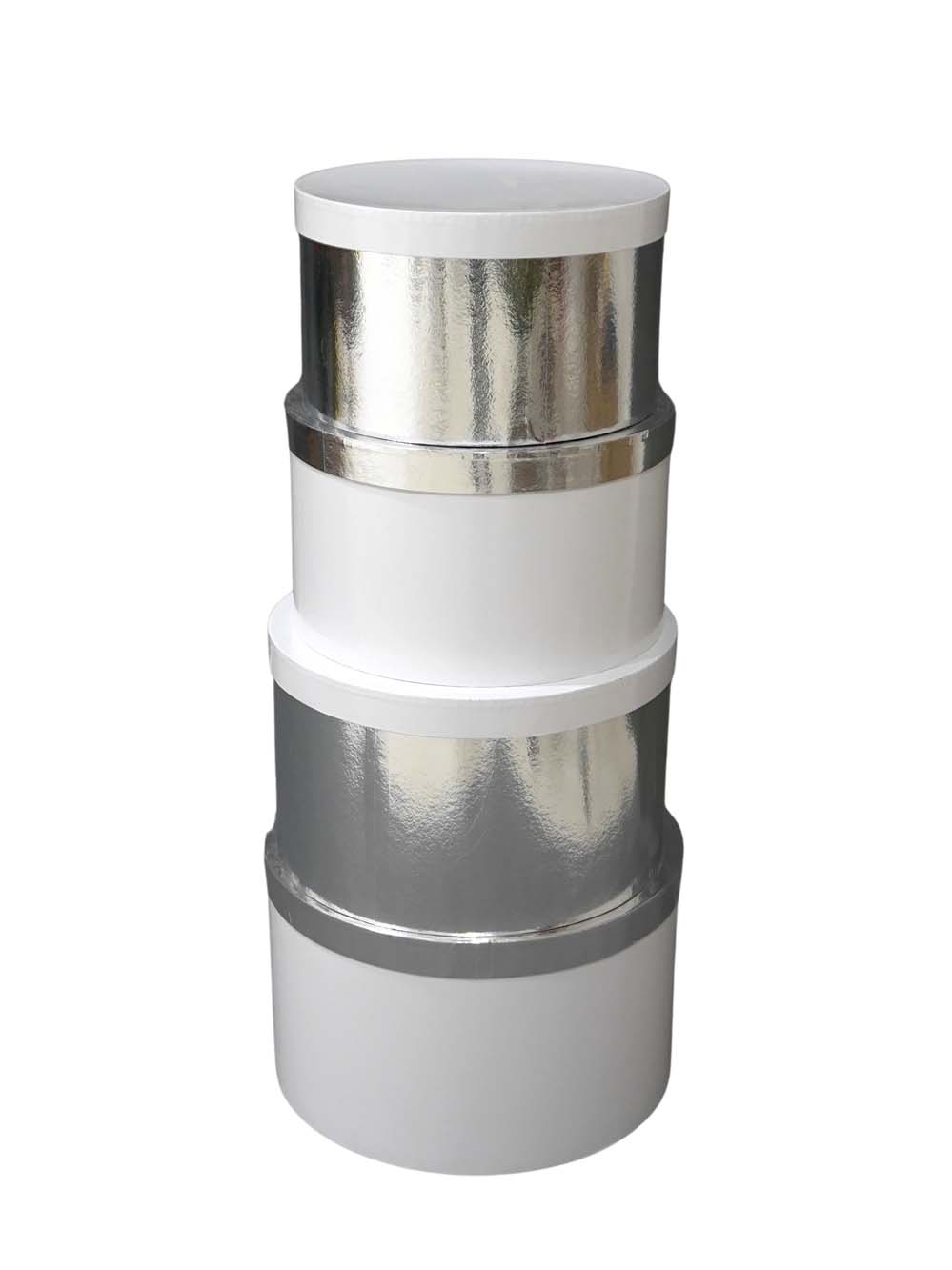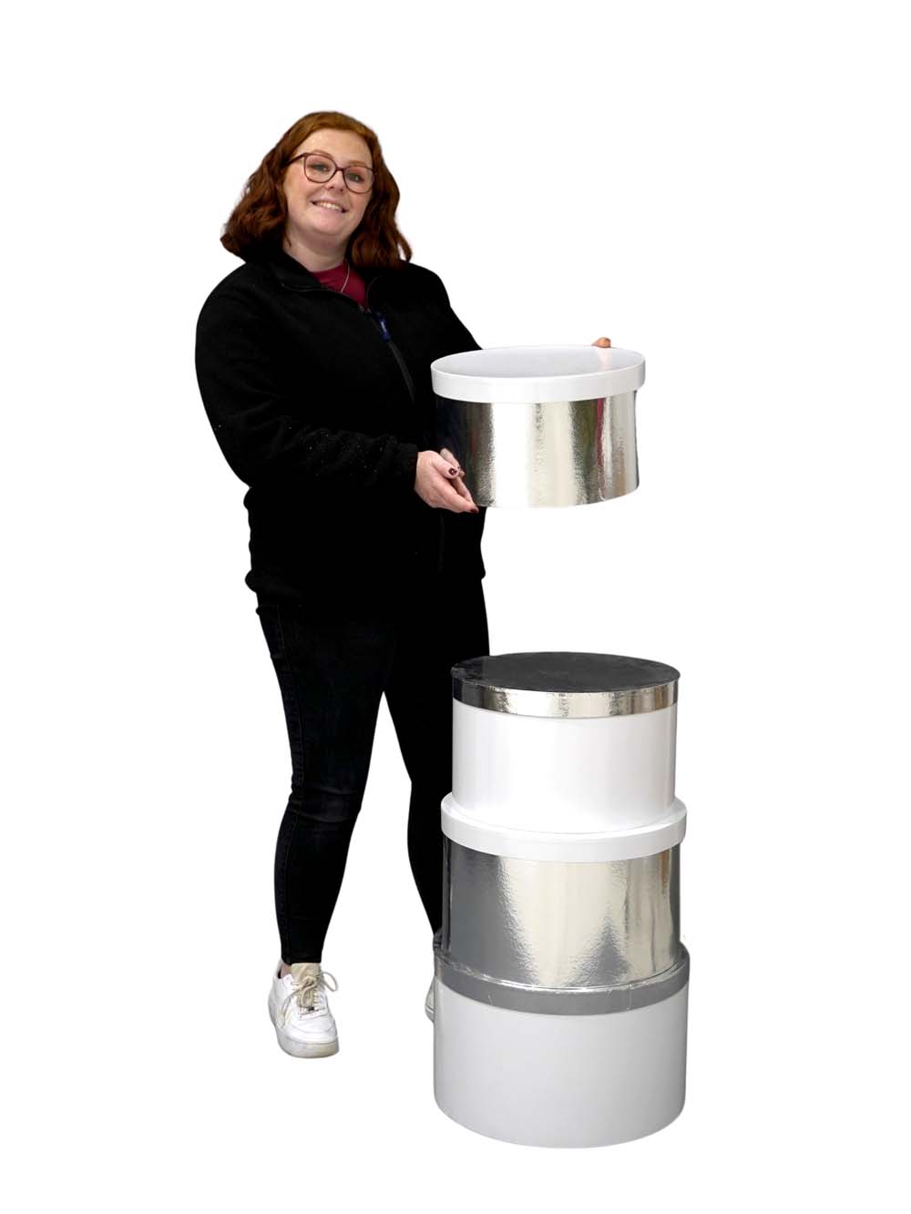 Round Present Boxes – Silver / White – (Set of 4) for hire Perfect for pretending you got more gifts than you did! Pop them under our dressed Christmas trees for the ultimate festive look!
