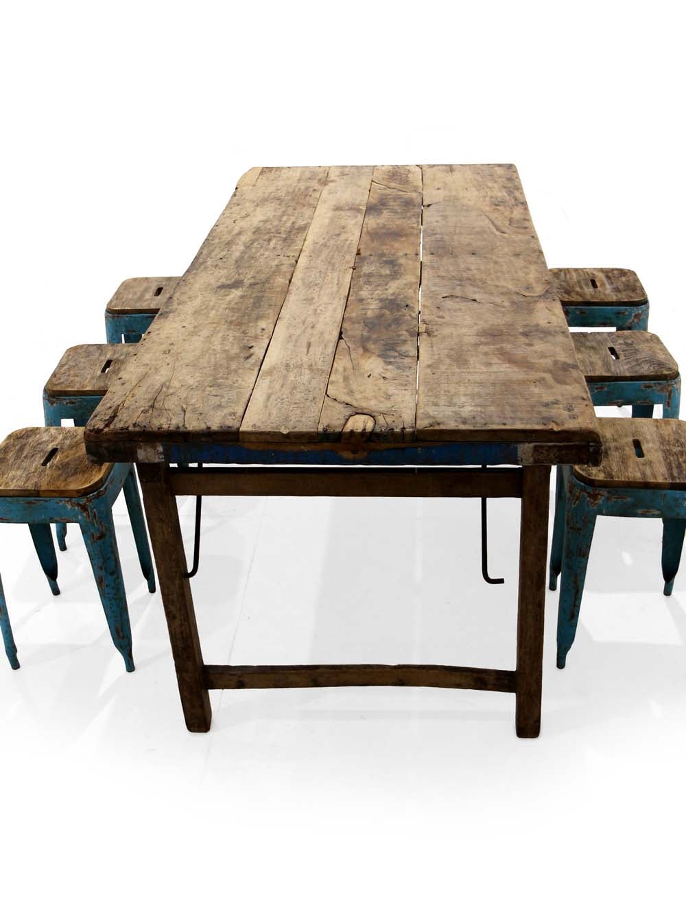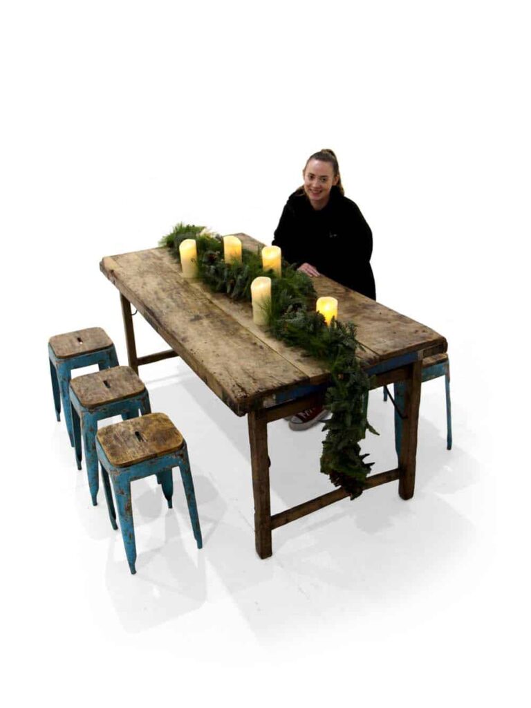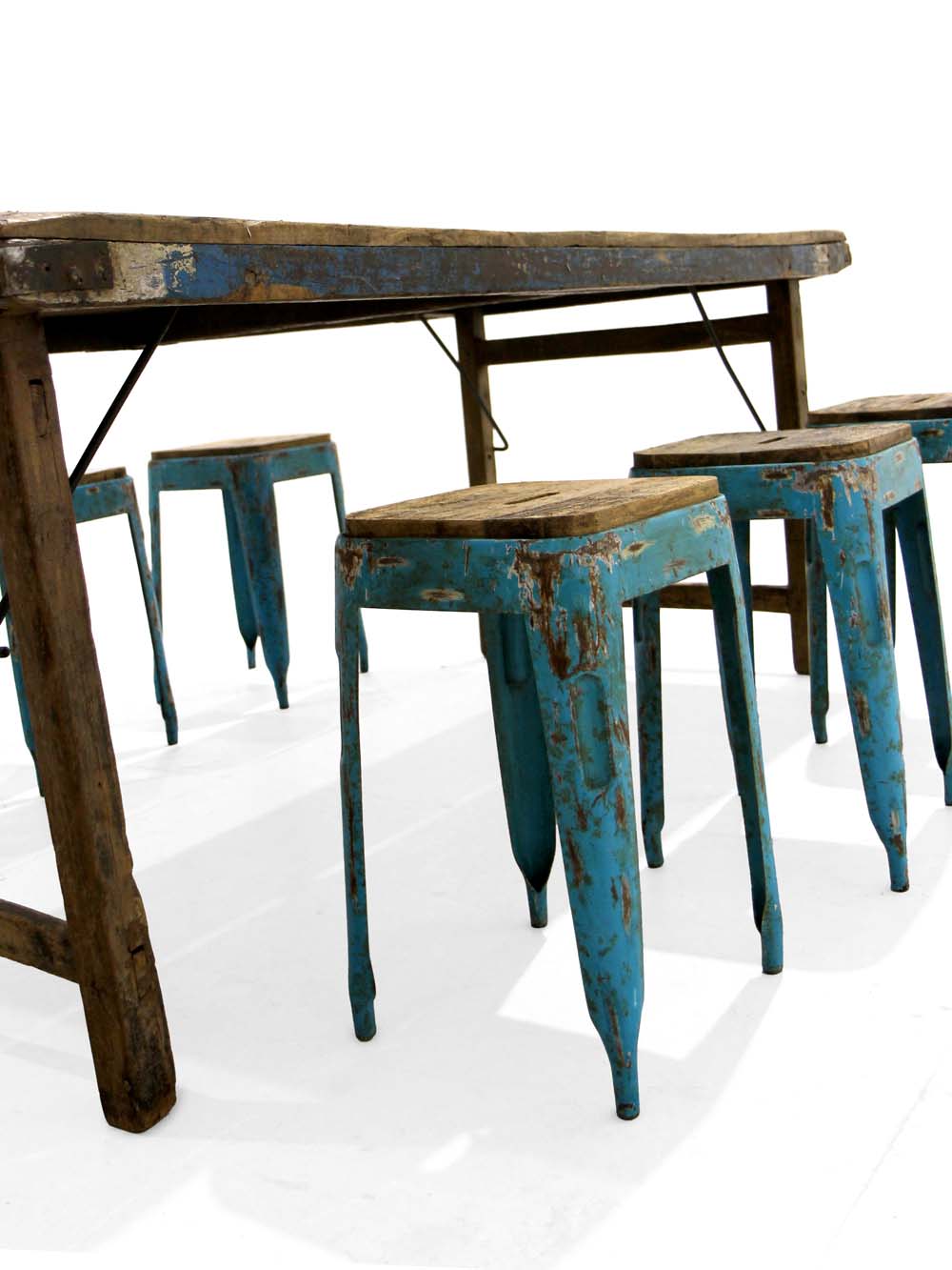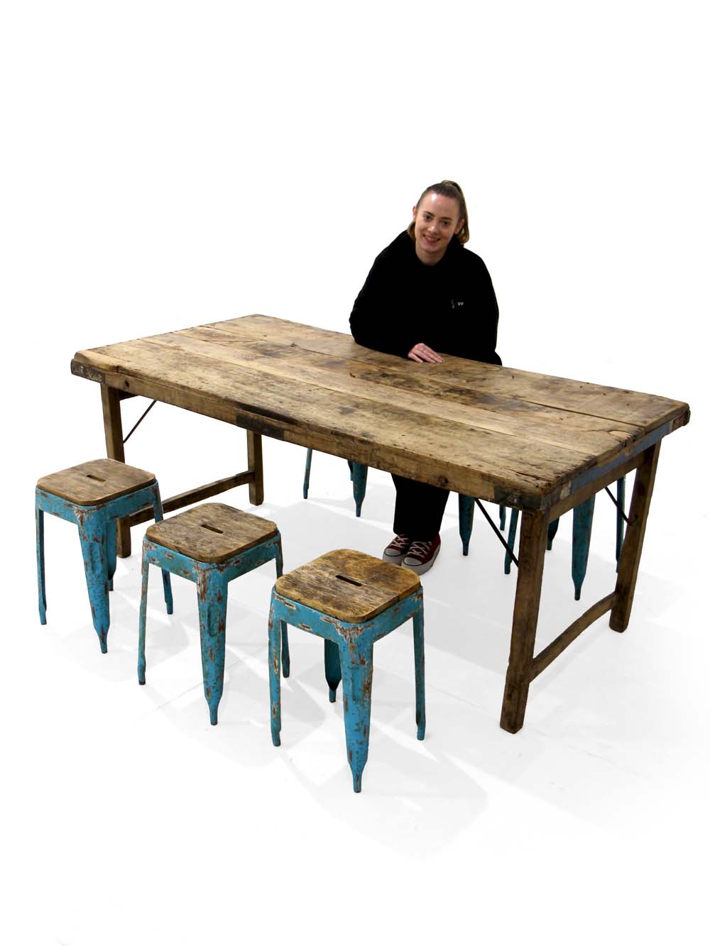 Rustic Dining Set for hire. Elevate your event with our Rustic Dining Set, a timeless addition crafted to perfection for gatherings of any size. This set features a large wooden dining table paired with 6 blue metal and wood low stools, perfect for a pop of colour!