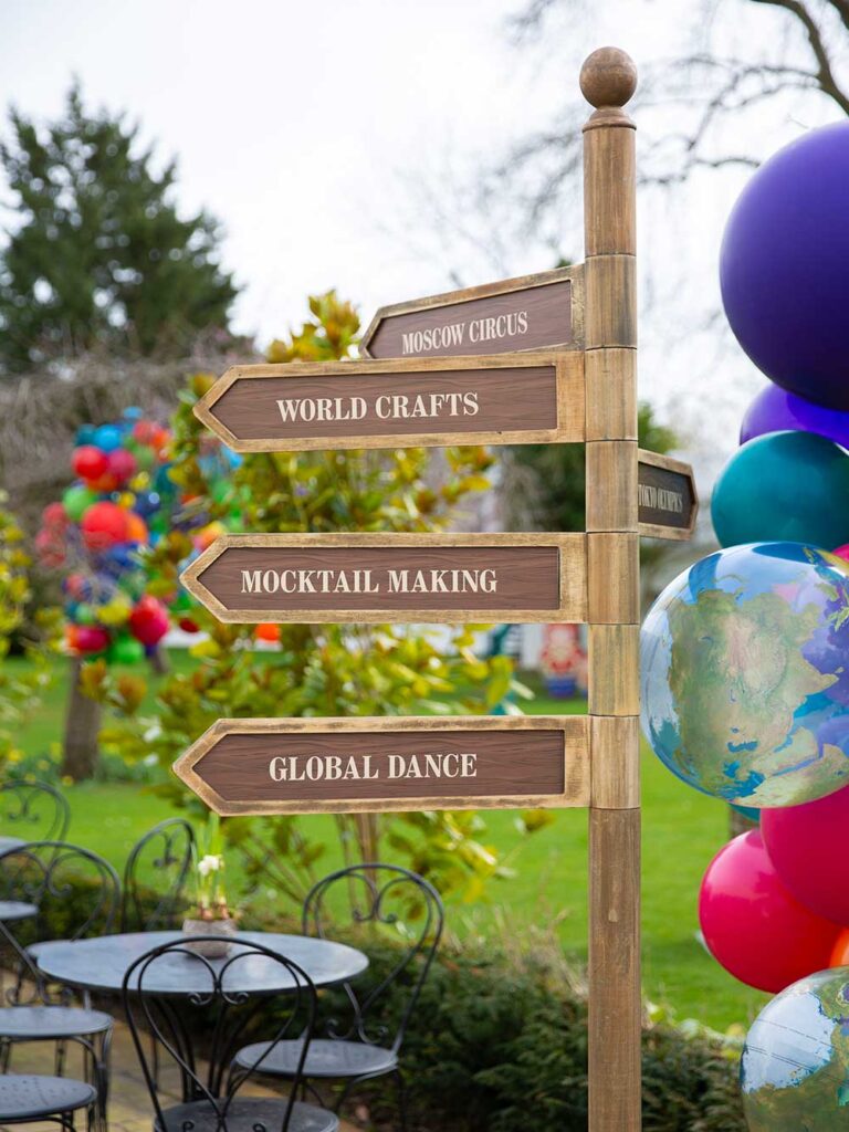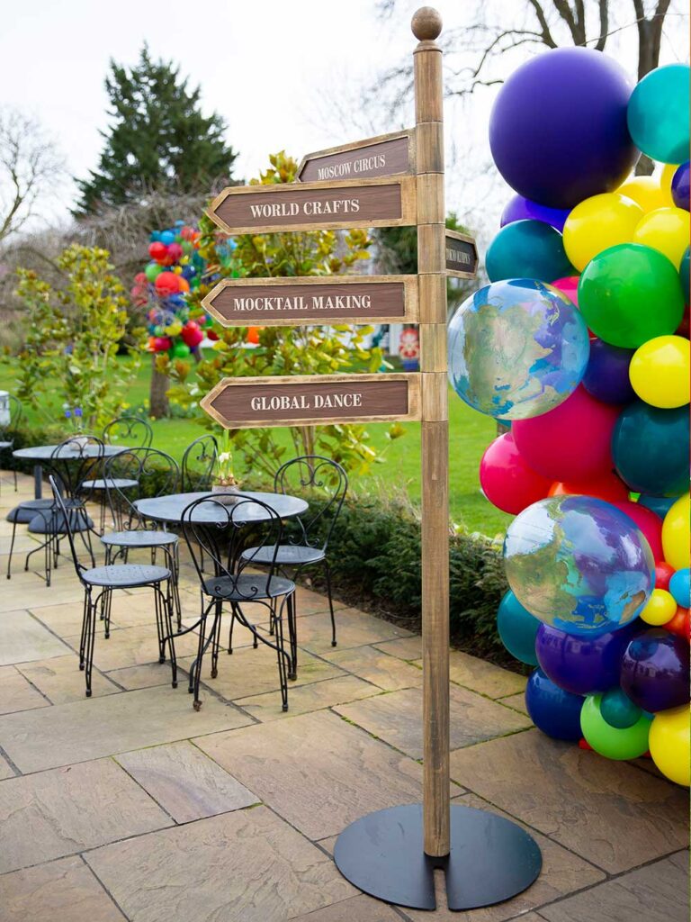 Rustic Multi-Directional Sign Post to hire. This signpost is very cleverly designed so that the directional arms can be rotated to point in different directions; allowing you full flexibility to highlight different ย locations within your themed event. Also available with just 2 or 4 rotating signs (also pictured) and in other colours. The cost quoted includes the ย customisation ย of the ย double-sided directional arms. This consists of a vinyl print on foamex which simply slips into the frame of the directional arm. We can create the customised artwork for your event. We have a highly skilled team of graphic designers who can help you with the customisation of our directional signposts. We can design customised graphics to suit your event theme. ย Contact us for more details. ย Alternatively you can customise this product yourself then we can take care of the printing for you, we just need your artwork. Alternatively you can customise this product yourself then we can take care of the printing for you, we just need your artwork.