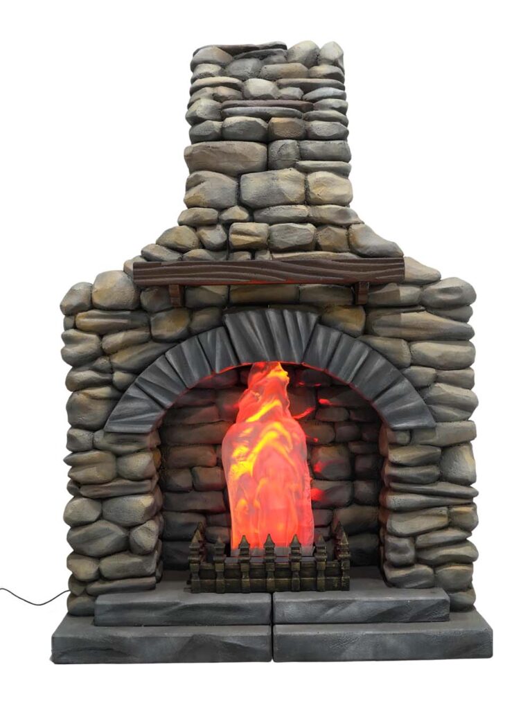 Rustic Stone High Fireplace for hire. This item will make the perfect addition to any Apres Ski, Medieval or Winter Wonderland themed event; in fact it fits many themes! The fire effect unit combines the use of water vapour with coloured lighting to create a very realistic fire-effect, but with no risk of causing burns. ย The prop also comes complete with a parcan light which adds the feeling of warmth to this fireplace.