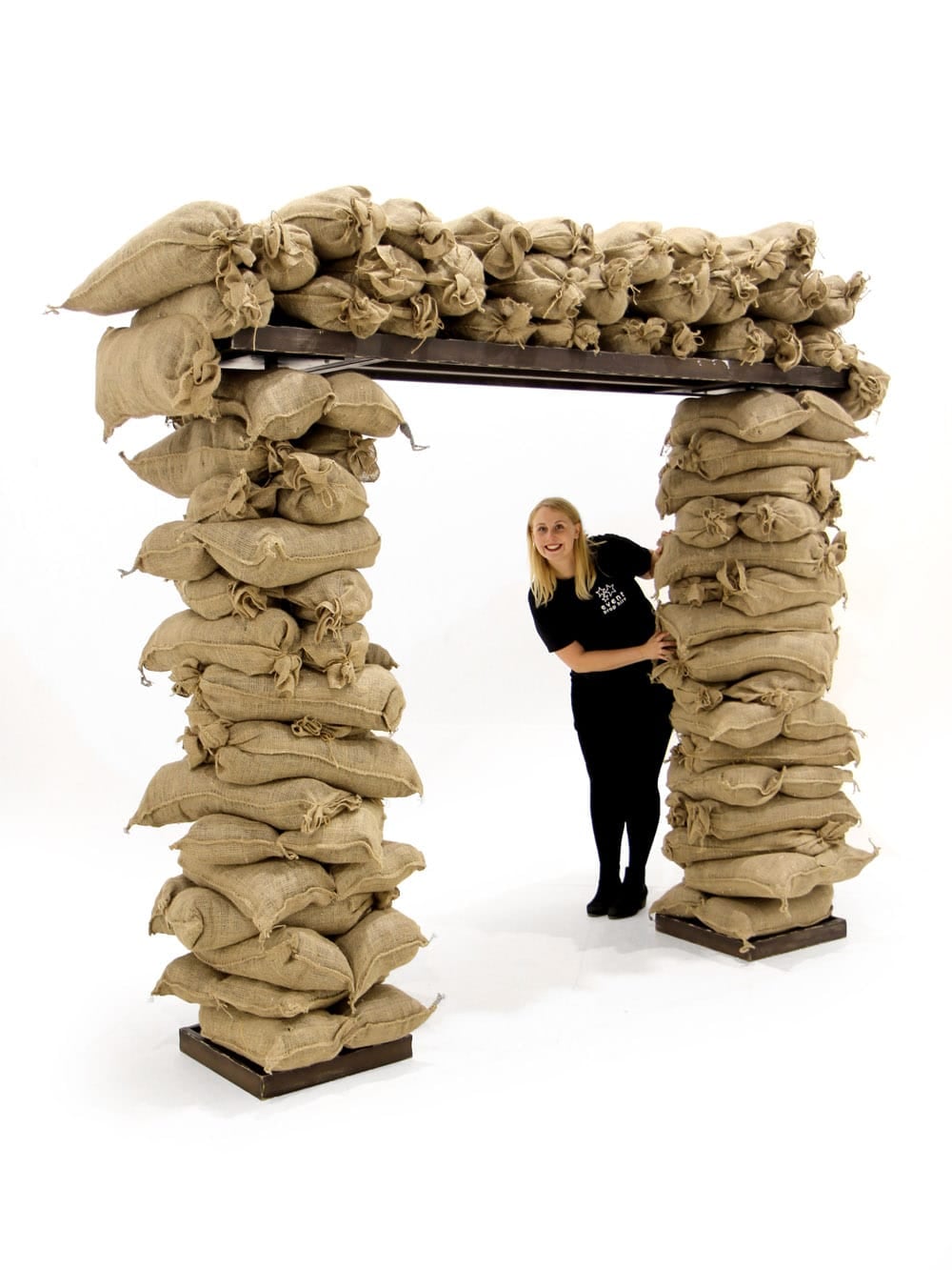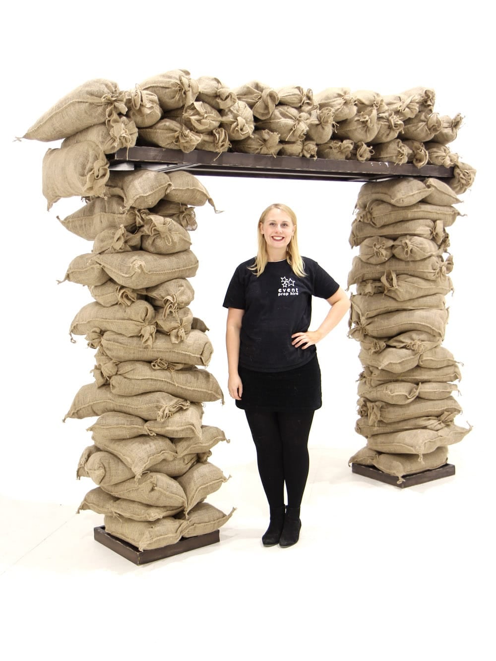Sandbag Entranceway to hire. This prop consists of lightweight filled hessian bags made to look like filled sandbags; easy to set-up at your event. This entranceway is perfect for any 1940’s or wartime themed event party. You can also hire sandbag columns on their own.
