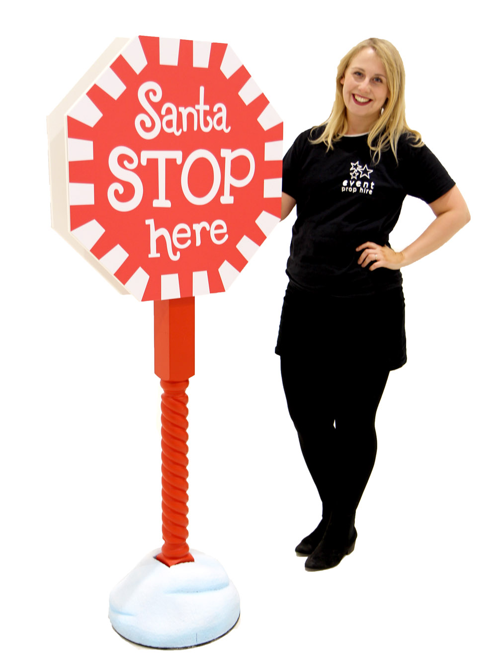 Santa Stop Here Sign for hire. Santa Stop Here Sign is a Christmas decoration favourite and is a fantastic addition to any Christmas themed event. Try pairing our ย Santa Stop Here Sign with our beautiful range of Snowy Trees and Standing White Twig Reindeer for a fabulous festive montage. Santa Stop Here Sign can be customised too so you can personalise the text. Speak to our team to find out more!