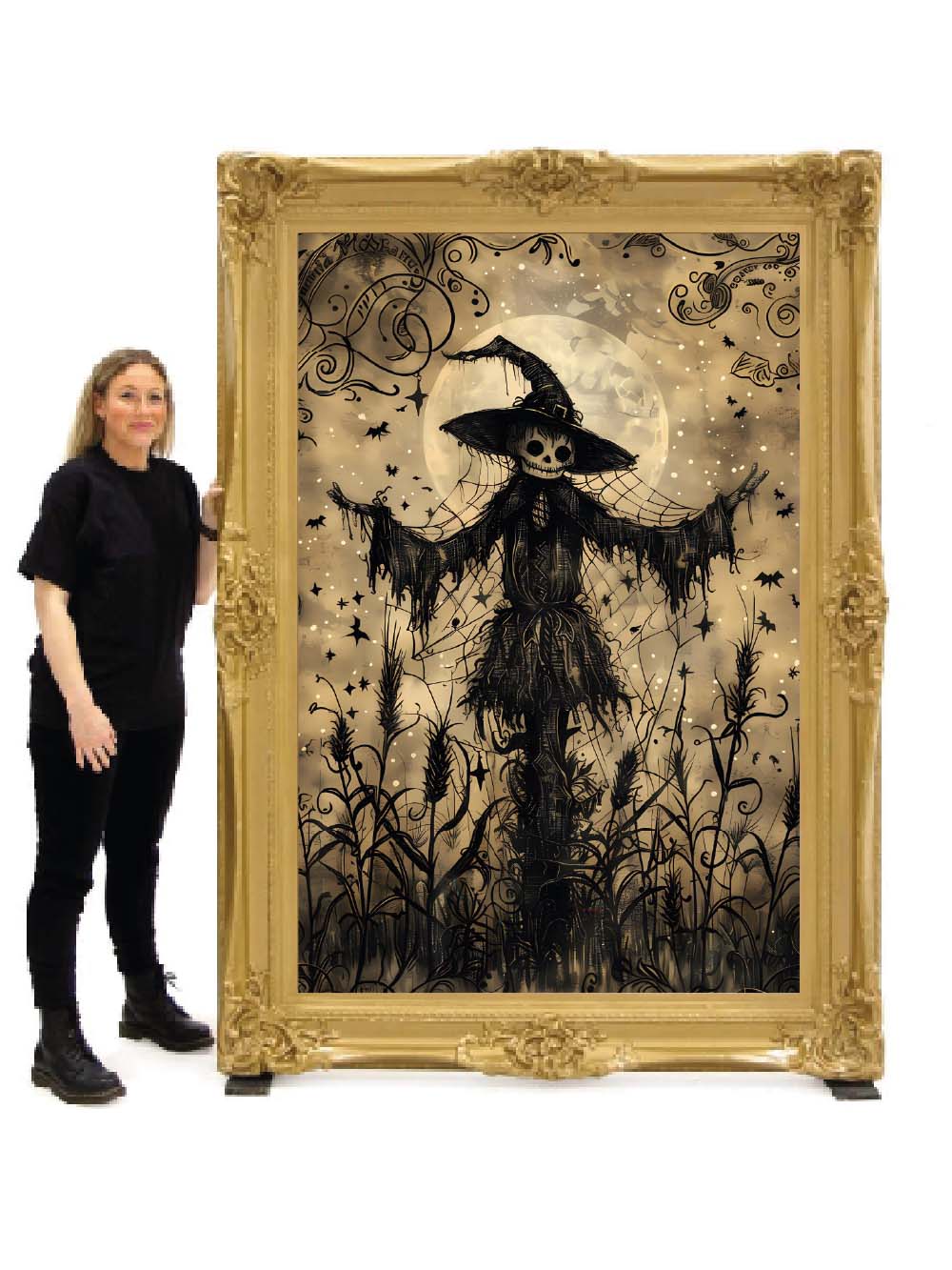 Scarecrow Halloween Book Graphic in Gold Frame. Great theming for Halloween Themed events. Check out the full range of Halloween theme prints in giant frames.