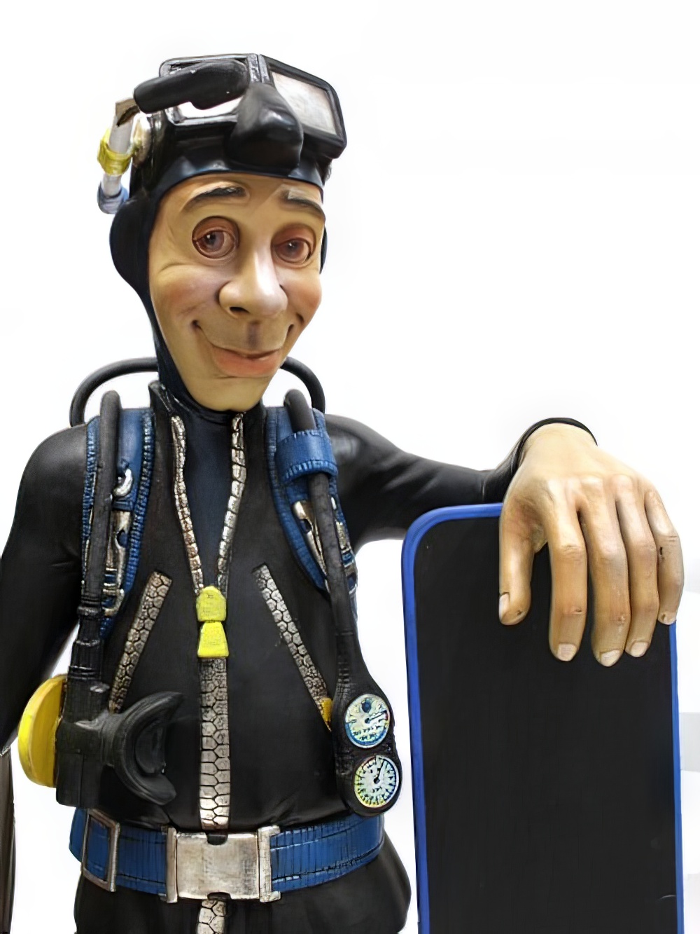 Scuba Diver Figure to hire. This fun scuba diver figure is packed with detail and is freestanding and fully 3D. He is holding a chalk board so you can write whatever message you like relating to your event or party!