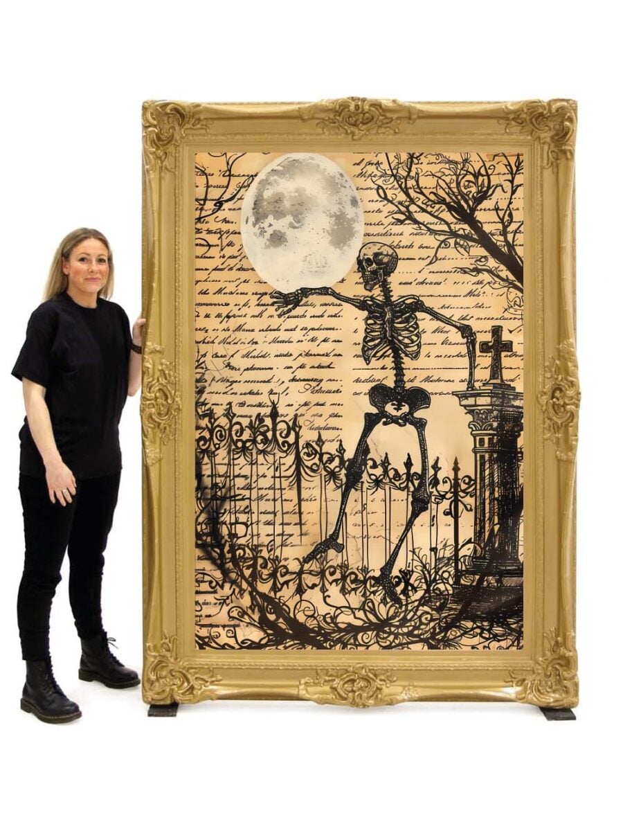 Skeleton in Graveyard Book Halloween Graphic in Gold Frame. Great theming for Halloween Themed events. Check out the full range of Halloween theme prints in giant frames.
