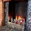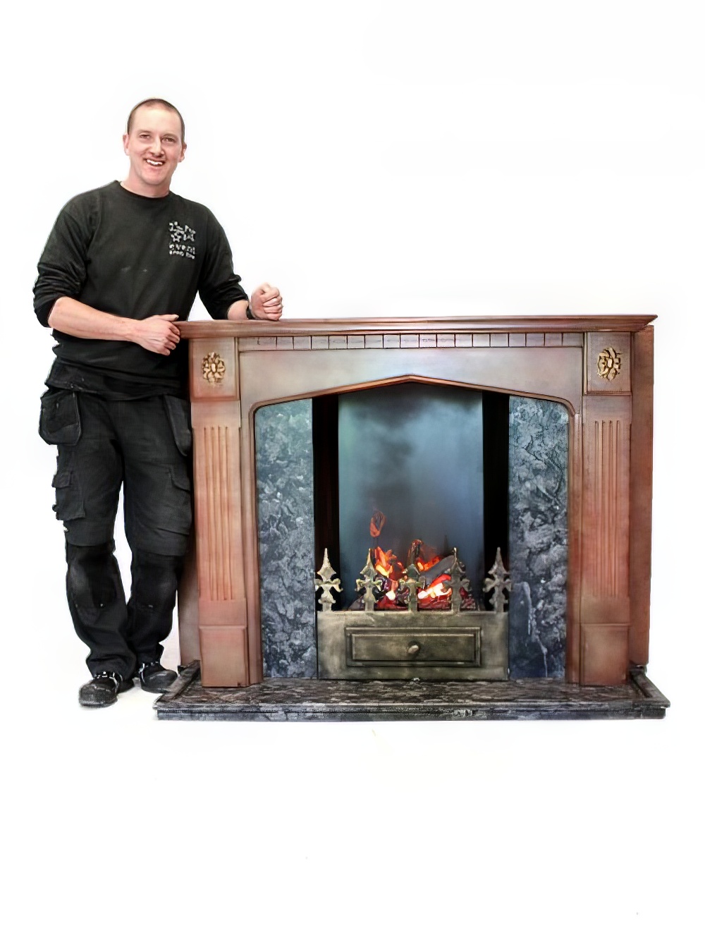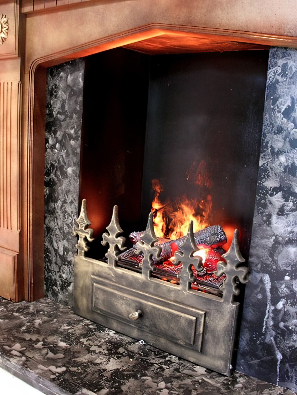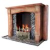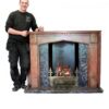 Small Fireplace with ย fire effect unit for hire. The fire effect unit combines the use of water vapour with coloured lighting to create a very realistic fire-effect, but with no risk of causing burns.
