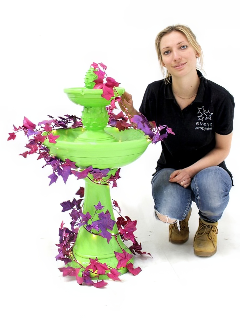 Small Fountain in green to hire. This lovely working fountain will make a fantastic table ย centre ย or ย centre ย piece at any Alice in Wonderland, Fairytale or Carnival themed event or party. The fountain comes wrapped in ivy and a further four ย colourways ย are also available (see below). The fountain is battery operated, with a battery life of approximately 8 hours. ย Also, the prop will come in a box which you will need to store for the duration of the event.
