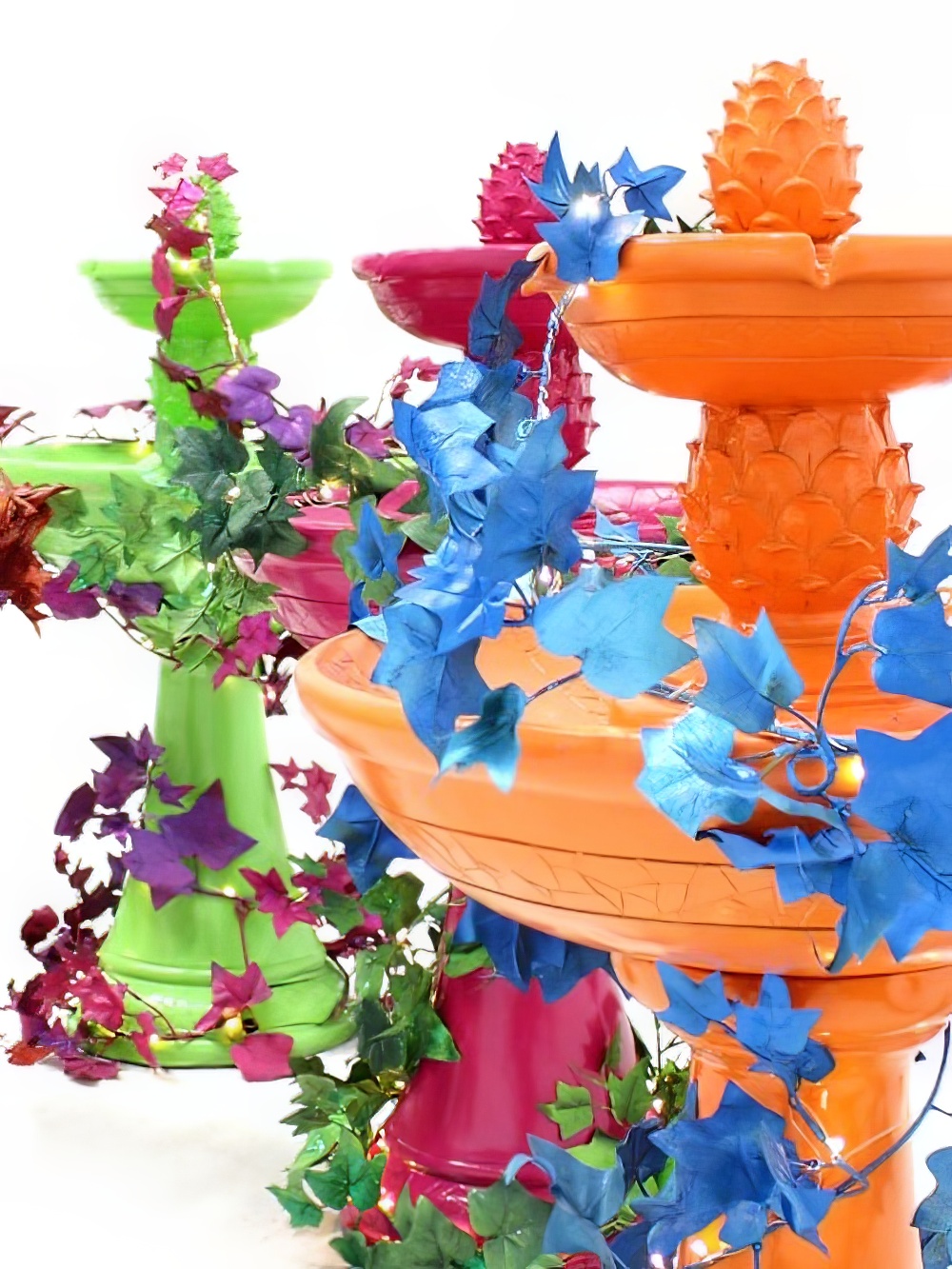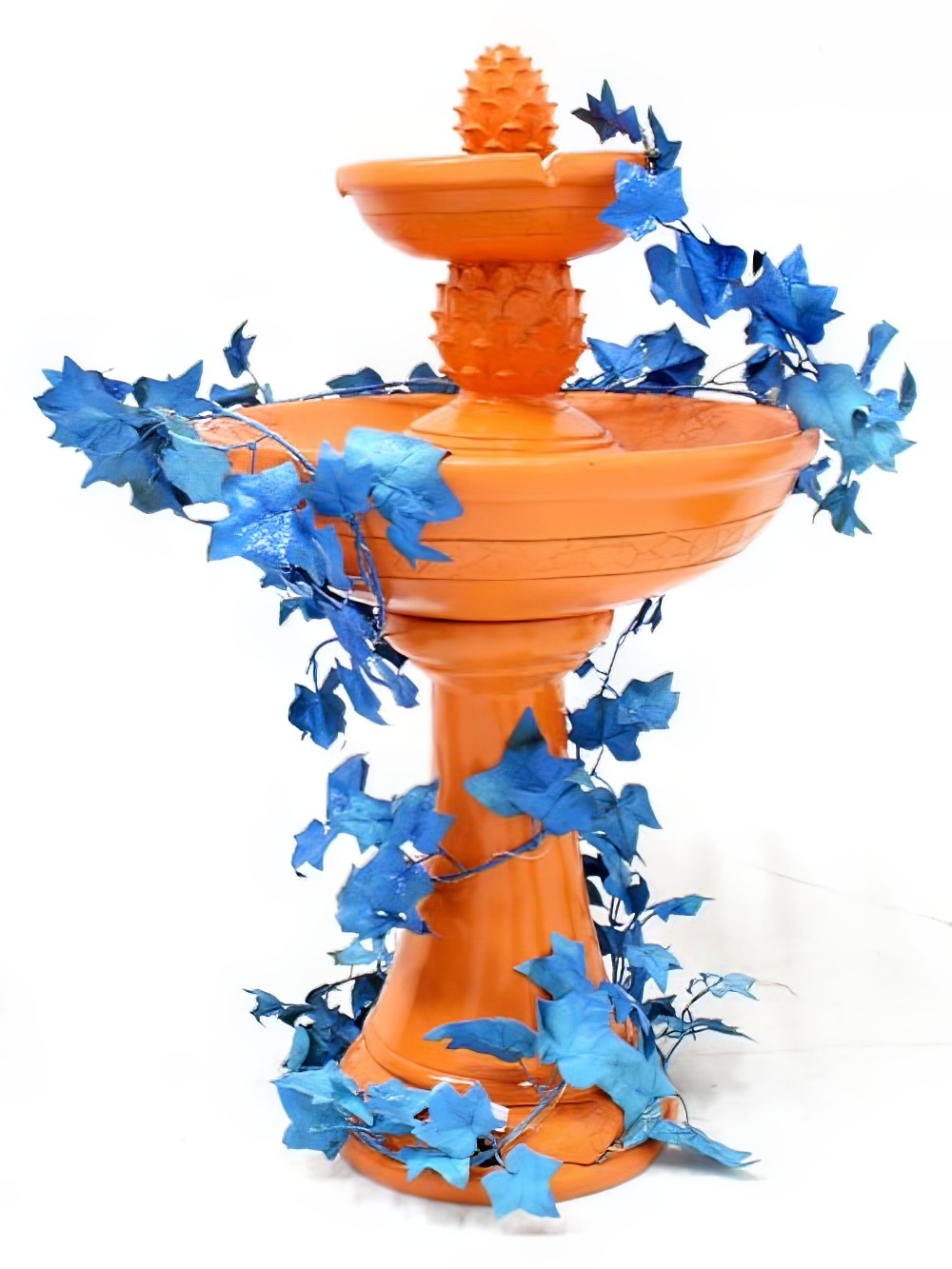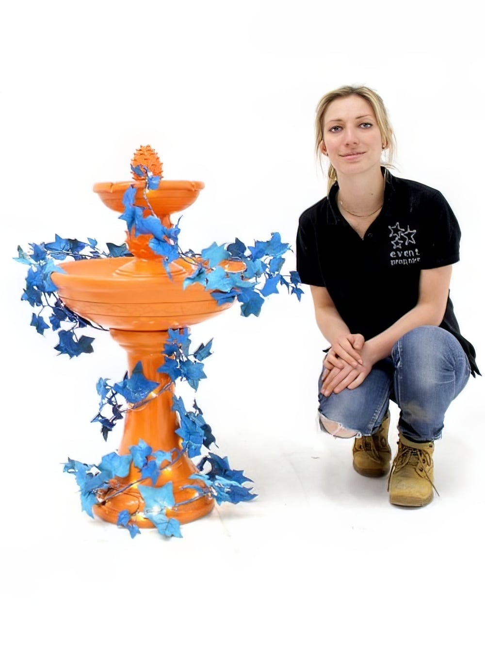 Small Fountain in orange to hire. This lovely working fountain will make a fantastic table ย centre ย or ย centre ย piece at any Alice in Wonderland, Fairytale or Carnival themed event or party. The fountain comes wrapped in ivy and a further four ย colourways ย are also available (see below). The fountain is battery operated, with a battery life of approximately 8 hours. ย Also, the prop will come in a box which you will need to store for the duration of the event.