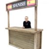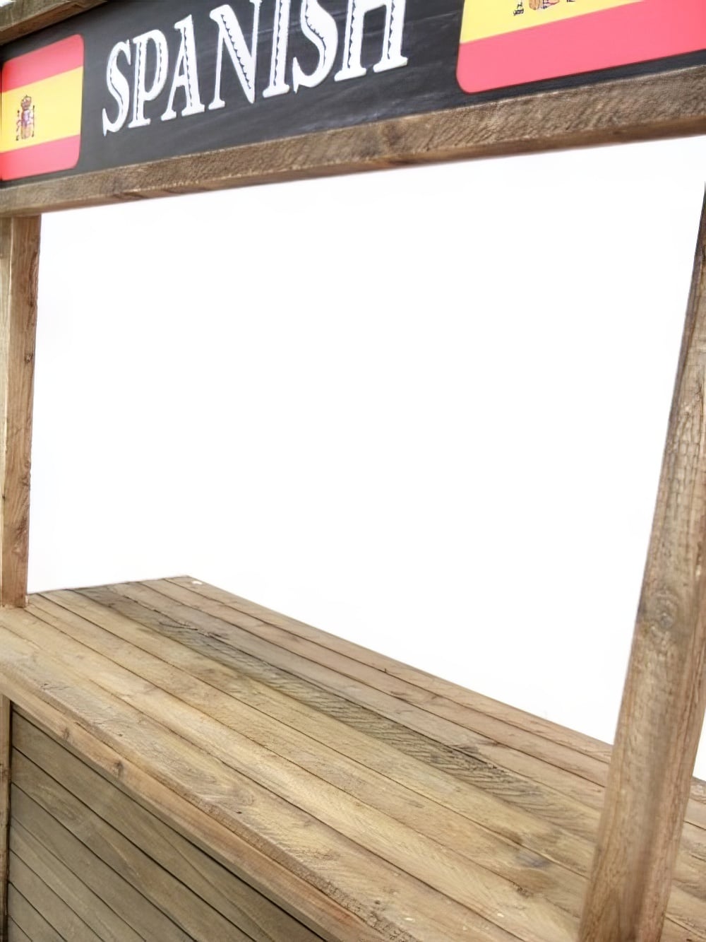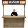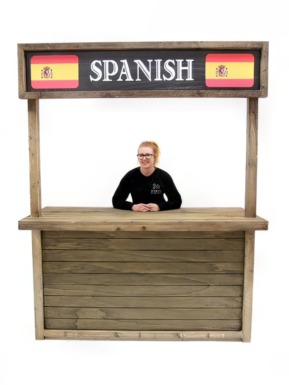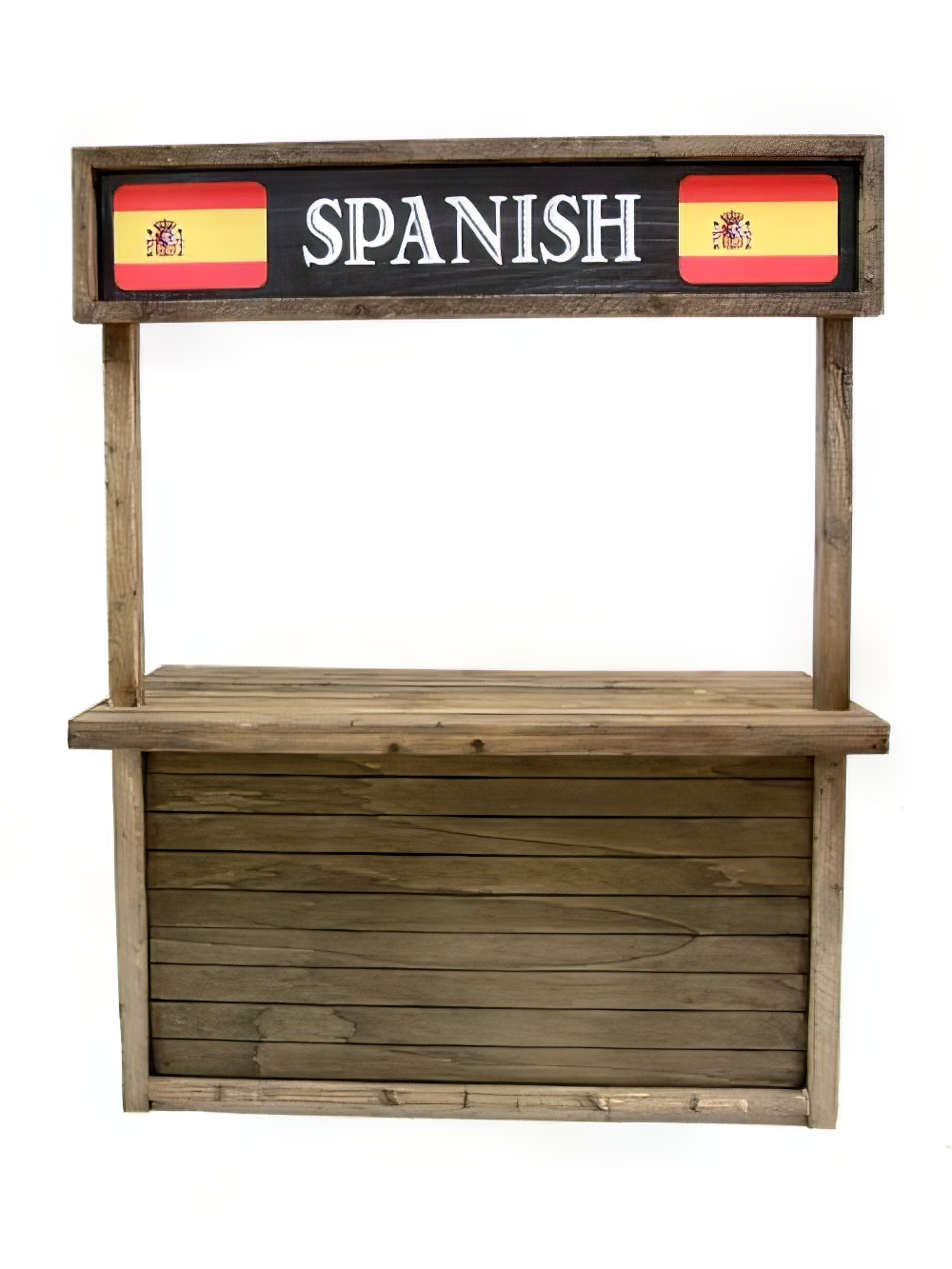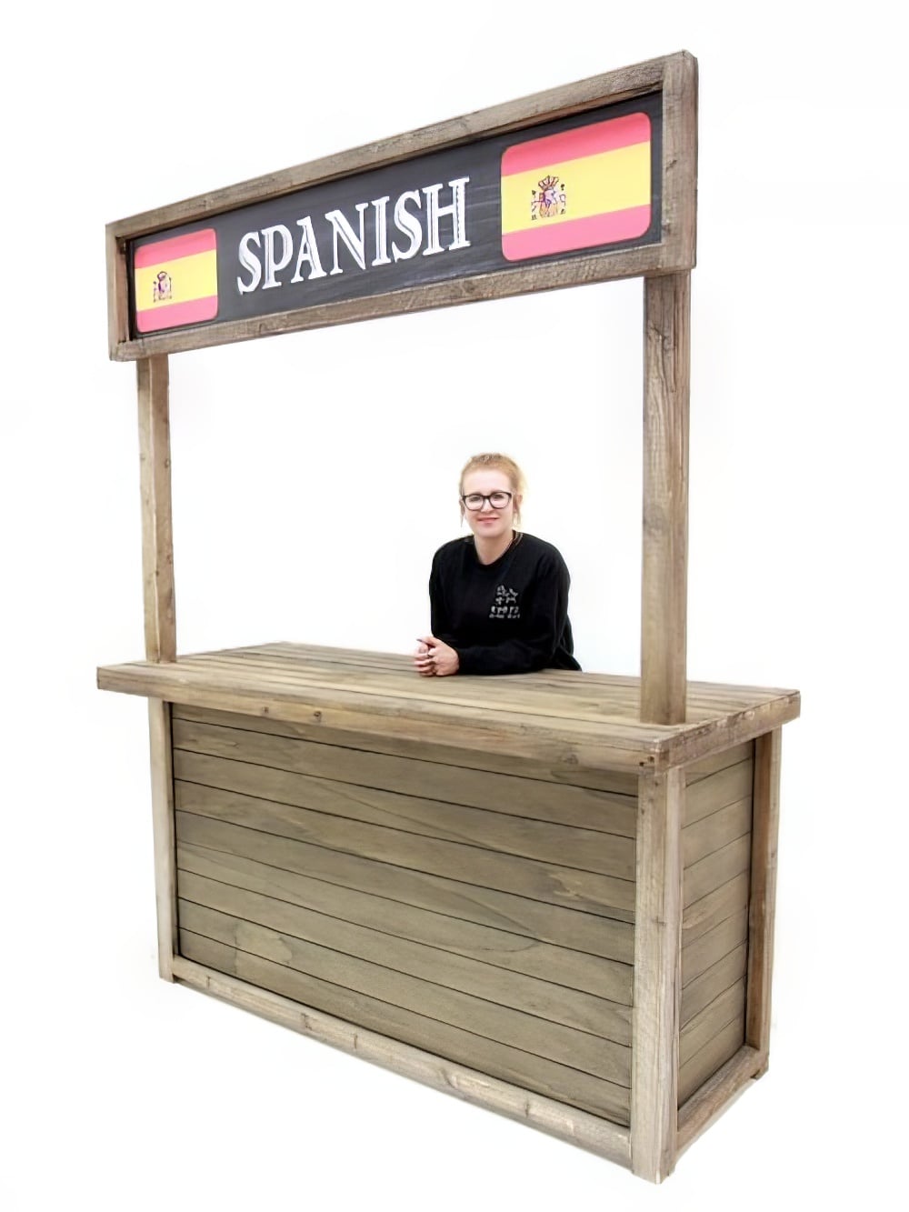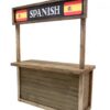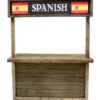 Spanish Food Stall to hire. This is a fabulous rustic looking food stall; perfect for any themed event. You can even choose whether you want the uprights and top sign positioned at the front or rear of the stall; simply set it up on site as you wish!