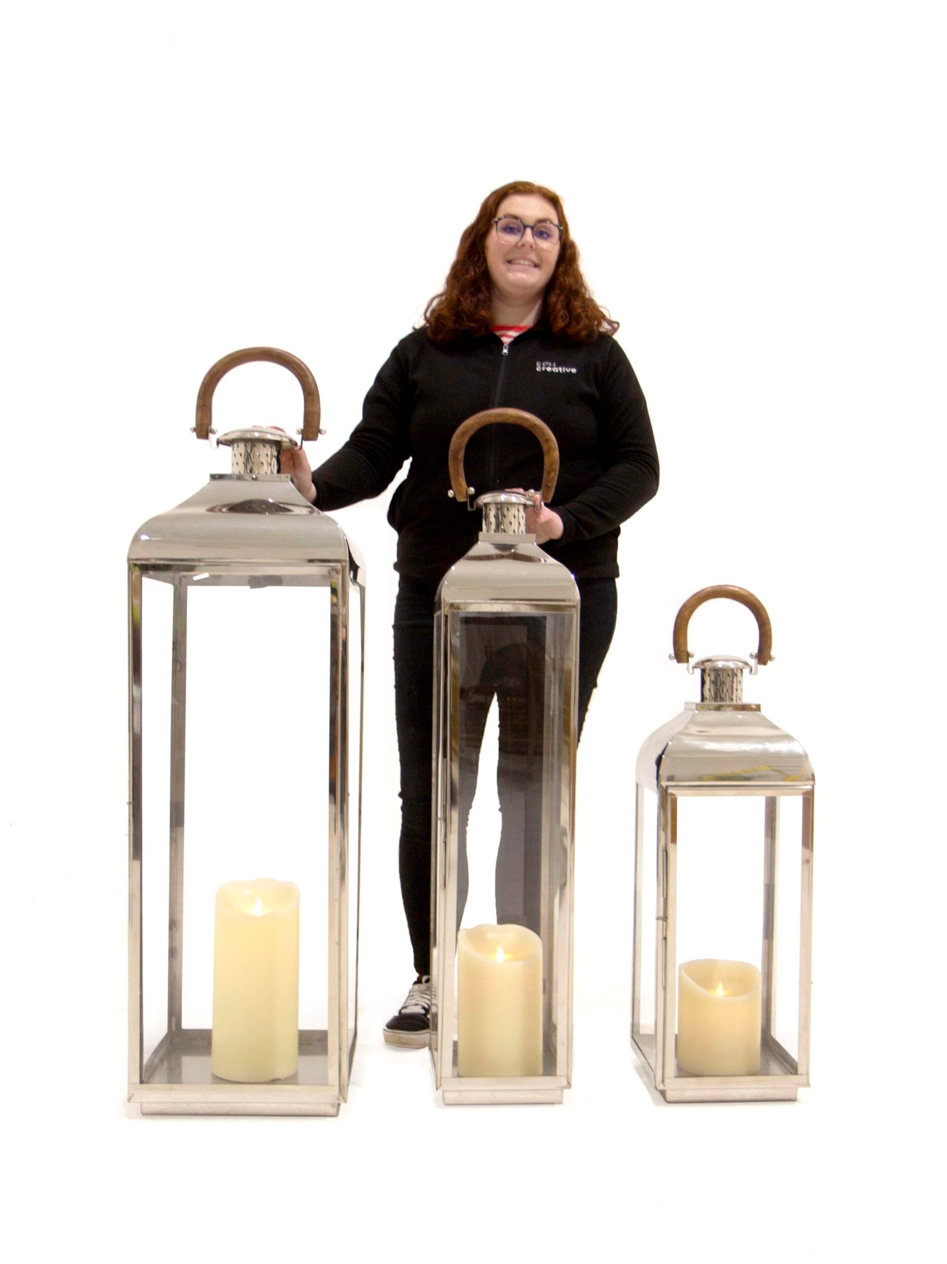 Stainless Steel Lanterns – Set of 3, to hire. These giant stainless steel lanterns will look great in any theme. Whether it’s at a wedding or a themed party, these lanterns are a perfect choice! The lanterns come with the set of 3 candles in the picture.