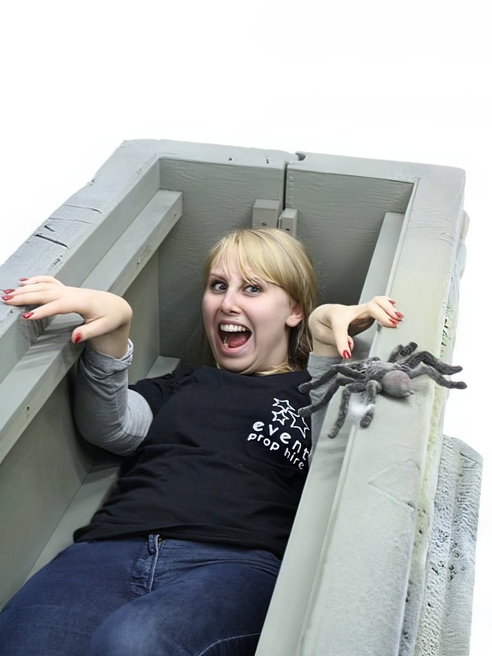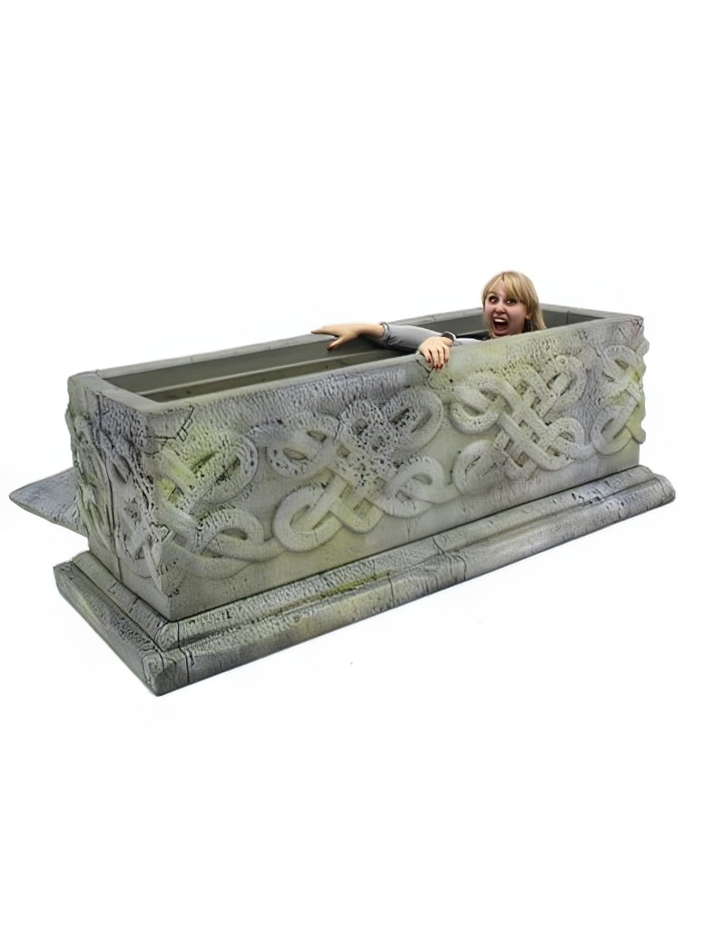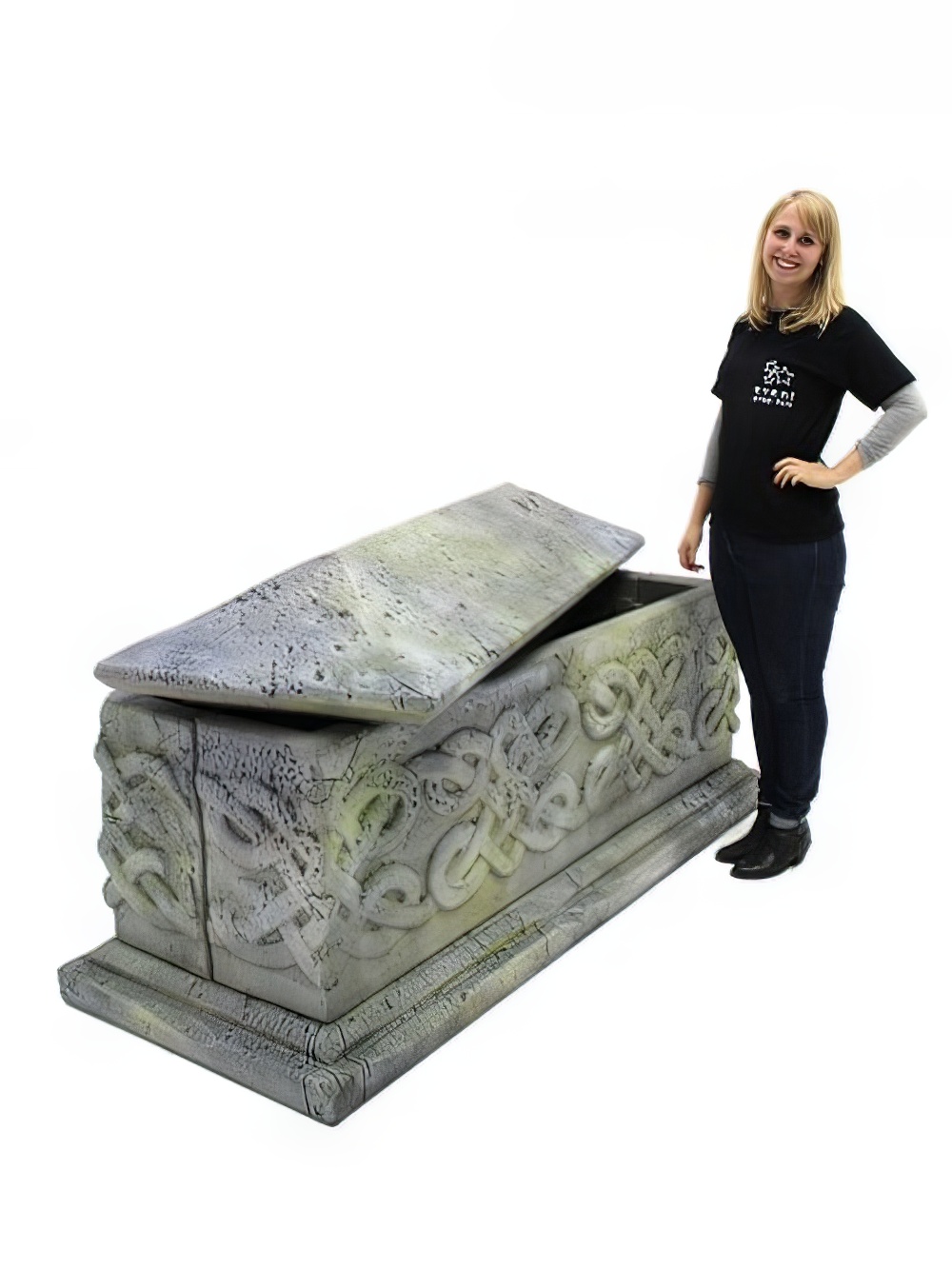 Stone Effect Coffin for hire. This coffin will look amazing hired with some of our gravestones to create an ultra-realistic grave yard at your event or party. And even better, the lid of the coffin is removable ย so your guests are welcome to lie inside the coffin for a freaky photo opportunity!