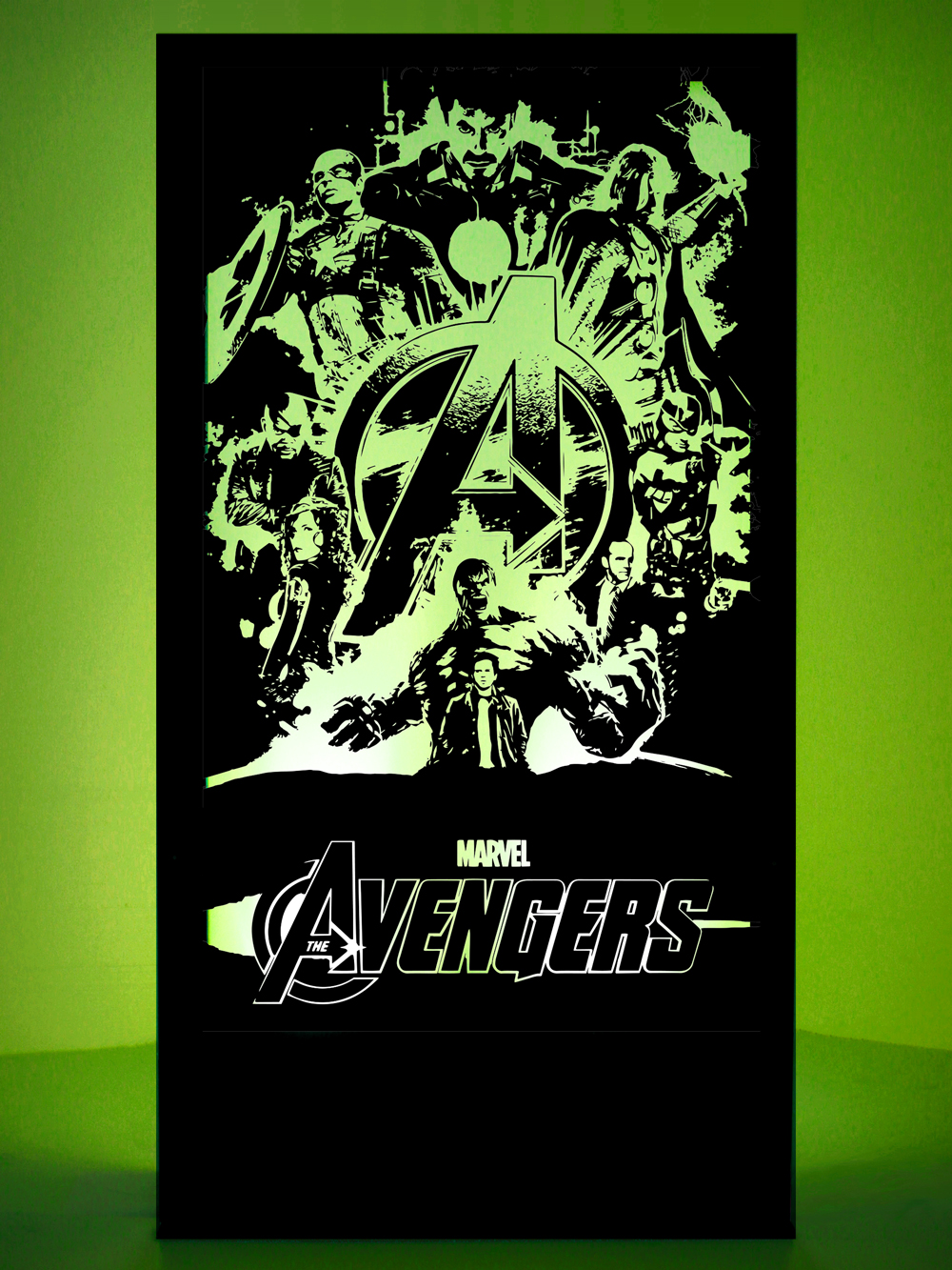 Lit silhouette panel depicting the Avengers. Actual lighting colour supplied may vary from that shown. All Parcan lights have a 1m lead and it is the responsibility of the client to provide extension leads if longer leads are required. Price quoted includes one supplied light. We offer a customised version of this product here.