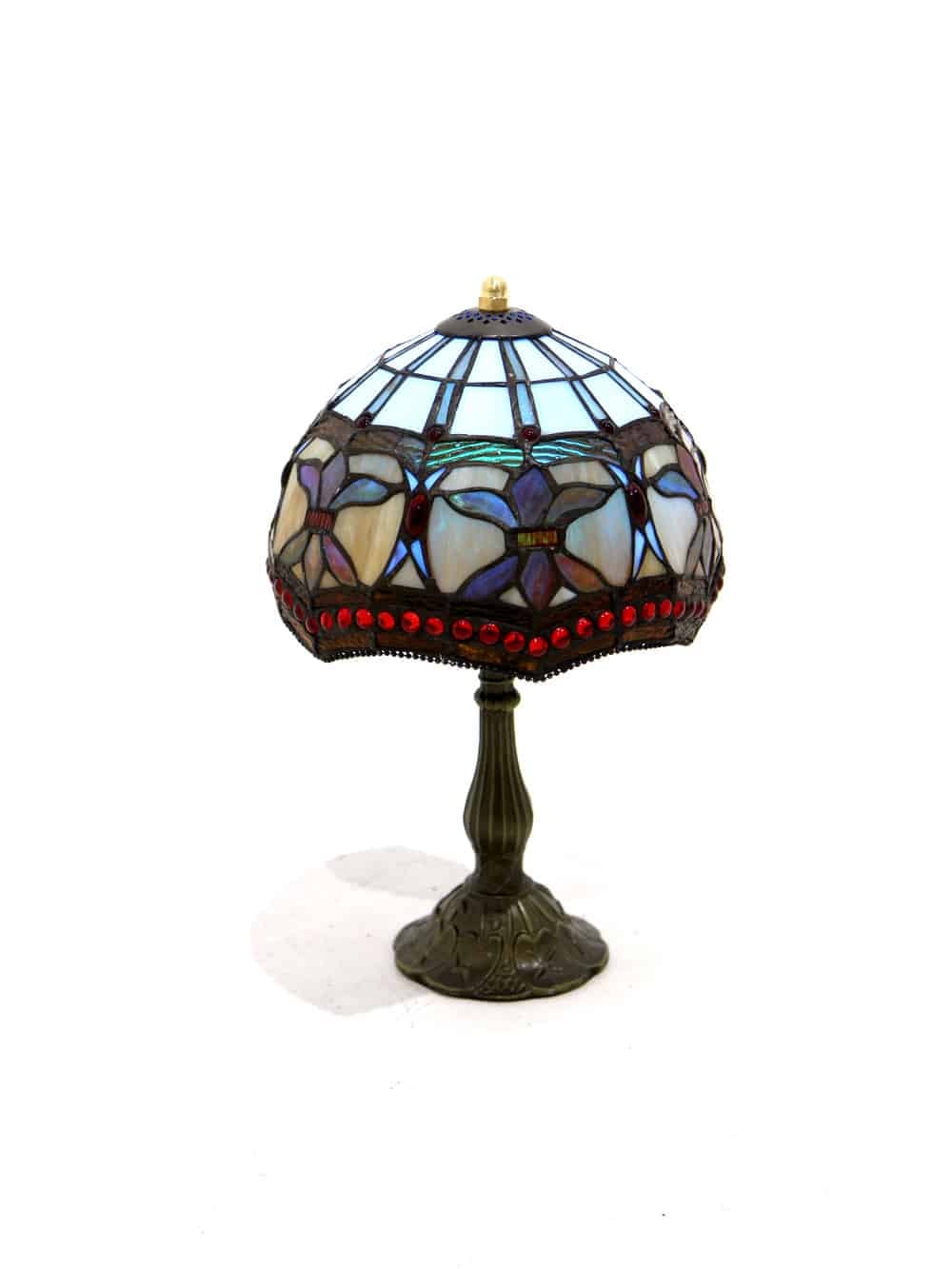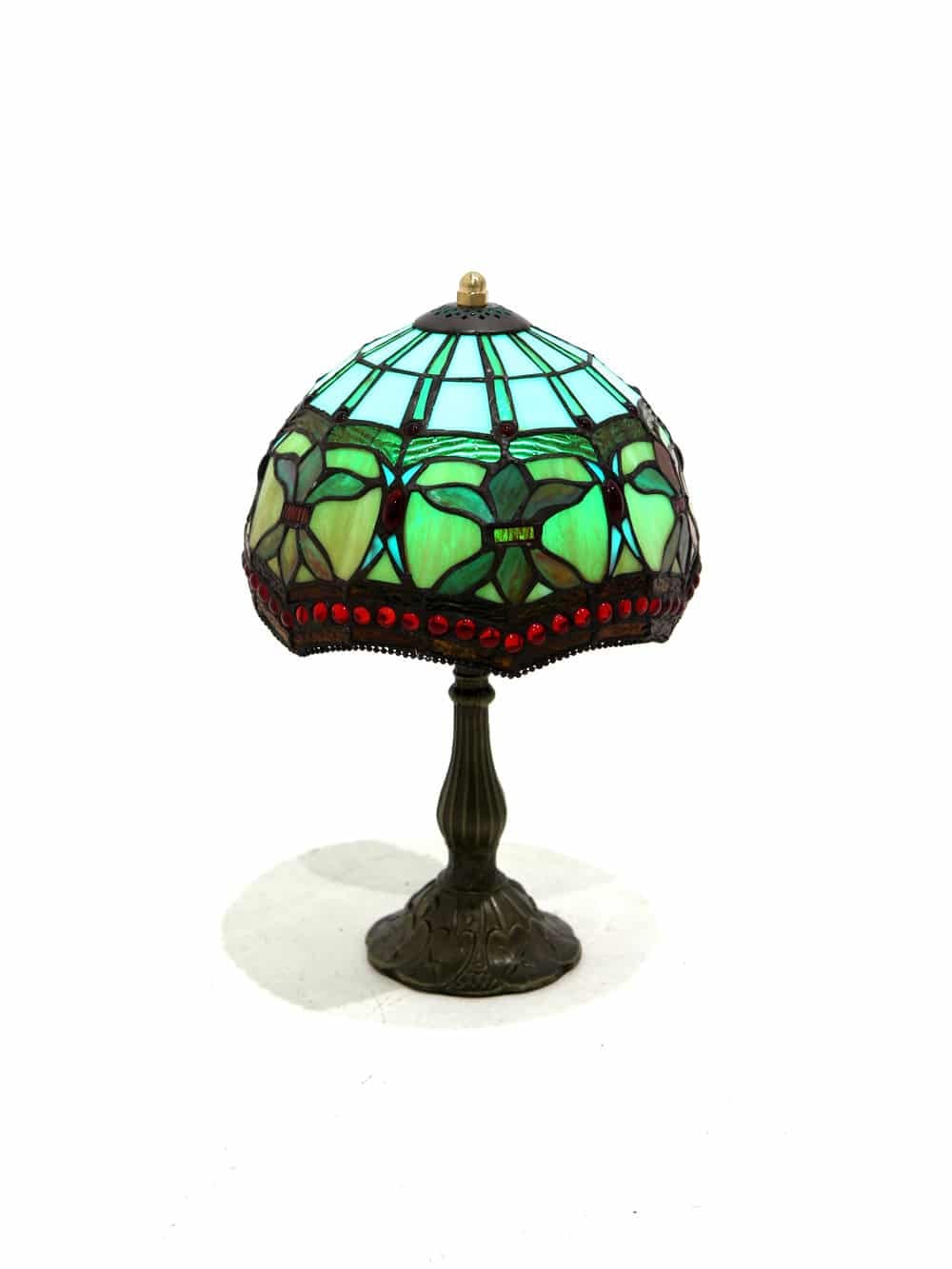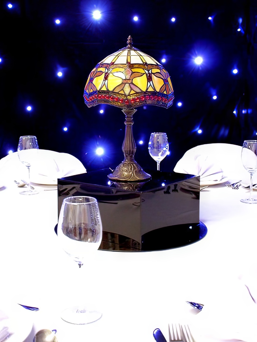 Tiffany Lamp Table Centre to hire. Perfect for any 1920’s or Speakeasy themed event or party, these Tiffany Art Deco style Lamp table centres ย will add a real touch of class to your event theming. Please note that the Tiffany Light Table Centre will provide a low atmospheric glow, rather than powerful lighting. These Tiffany Lamps are battery operated and that the actual design supplied may vary slightly subject to availability. This item will be sent charged for up to 8 hours of use. If you require a charger to be sent with your order please speak to a member of the sales team.