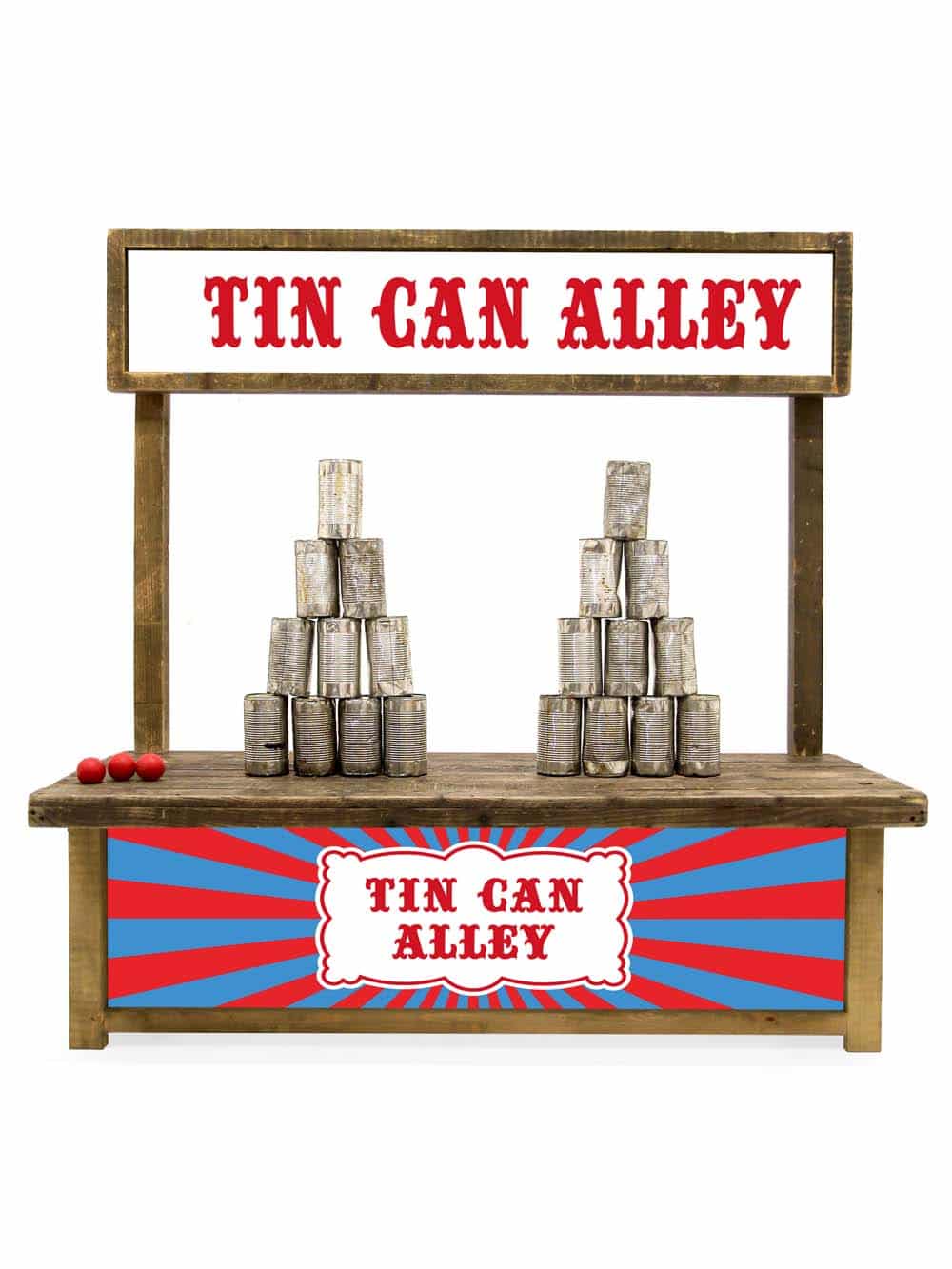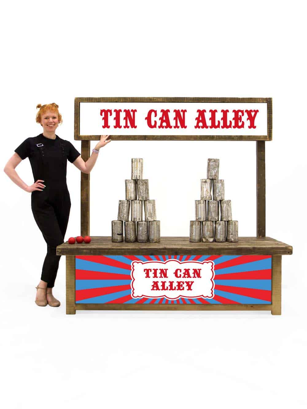 Chilrens Size Tin Can Alley Fairground Game for hire. Roll up roll up! Test your aim with our traditional Tin Can Alley Fairground Game. Try to knock as many tins off as you can with the supplied balls.