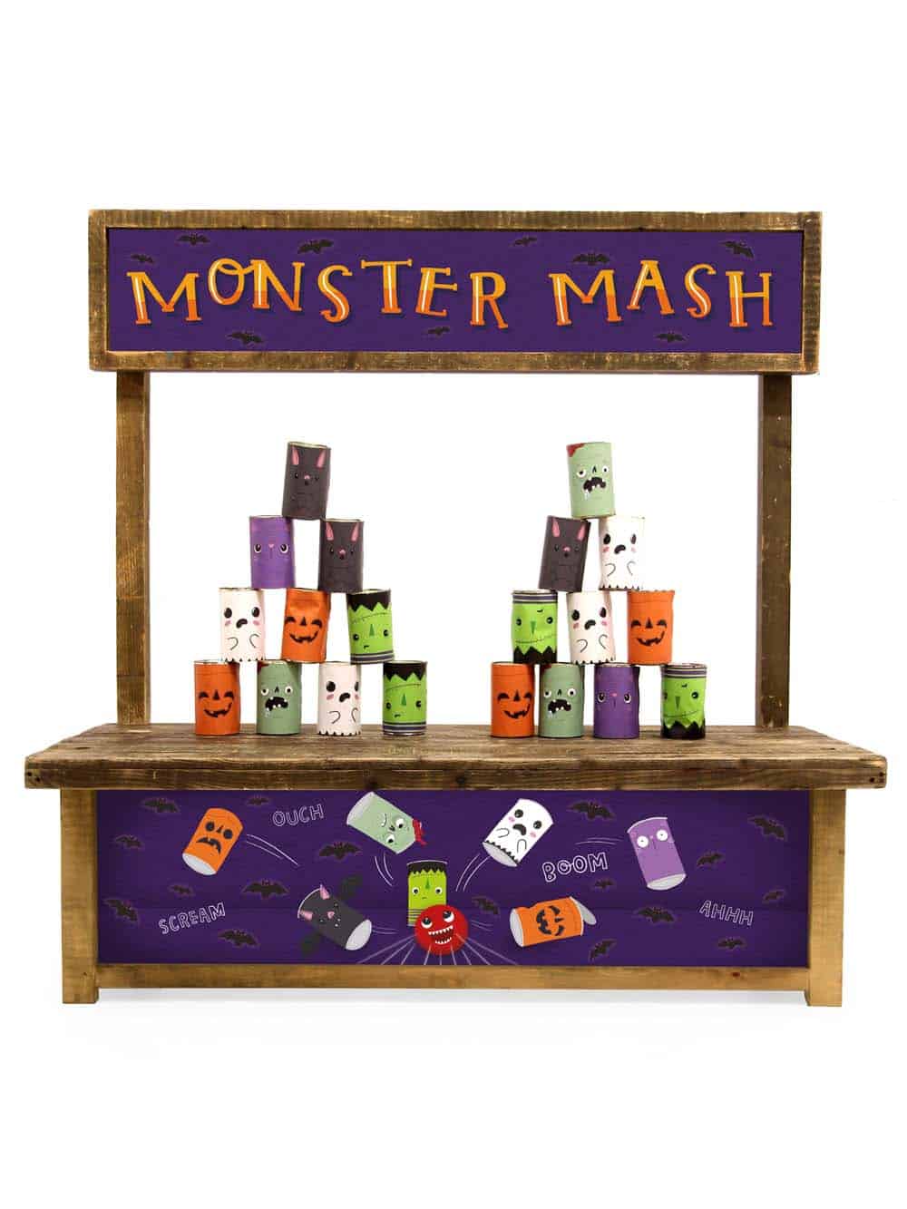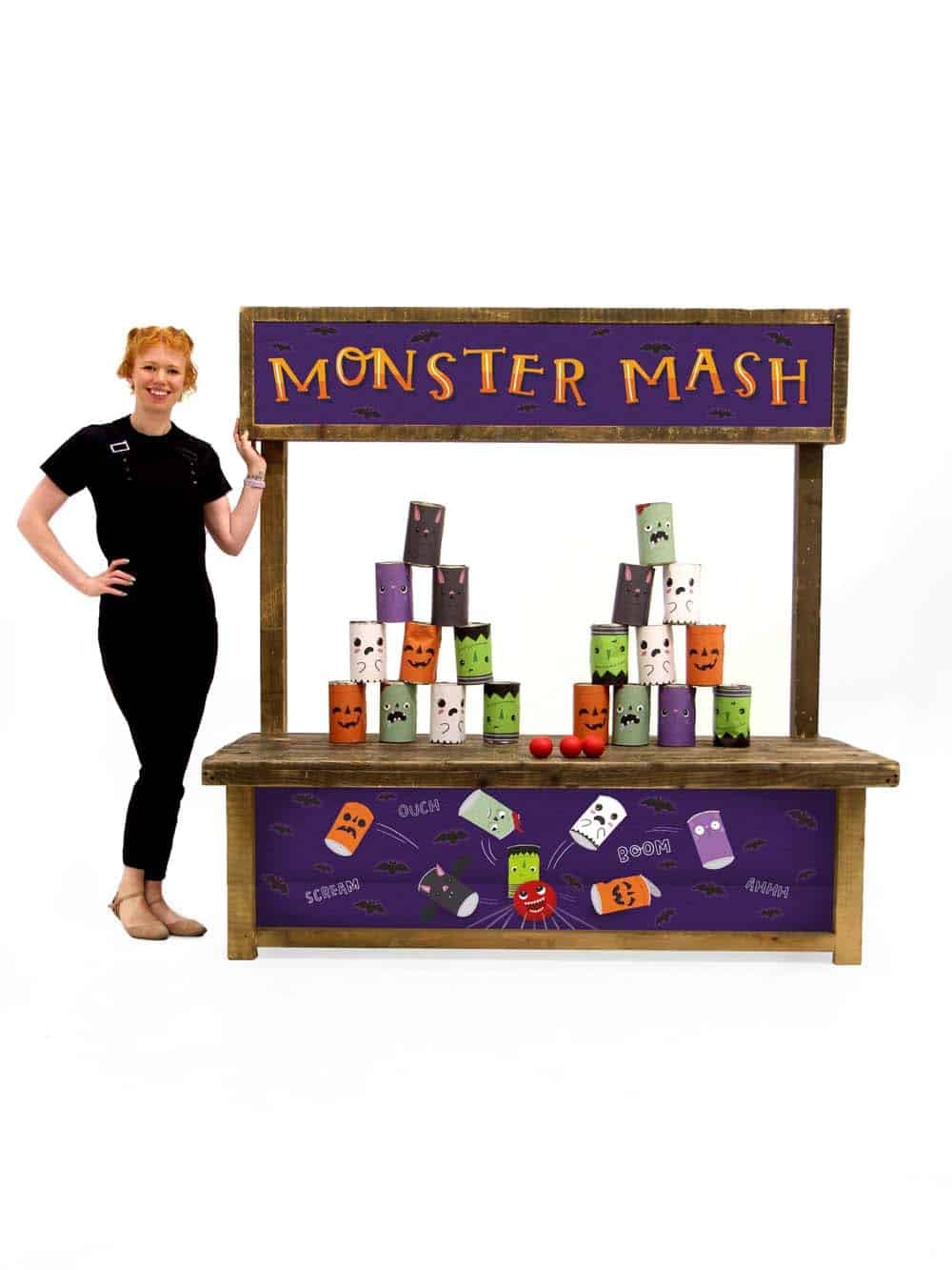 Childrens Tin Can Alley Halloween Fairground Game for hire. Roll up roll up! Test your aim with our ย Tin Can Alley Halloween ย themed fairground game. Impress your guests and try to knock as many cute monster themed tin cans off as you can with the supplied balls.