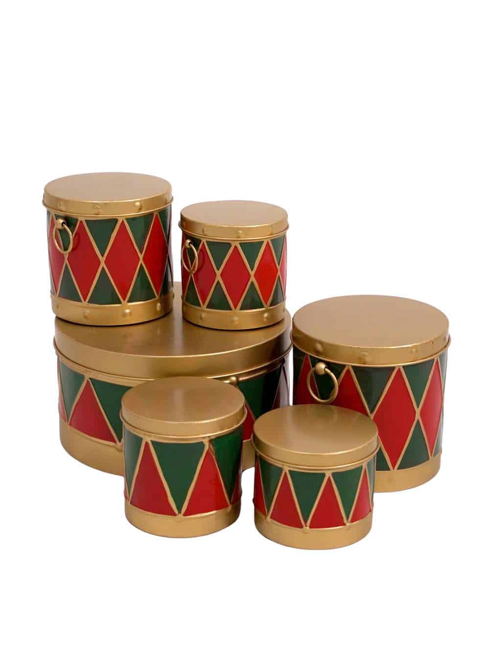 Tin Drums – Tall – Set of 3 for hire. Great as a small dressing prop or as a practical storage solution, our tin drums have a removable lid and classic read, gold and green design for a festive feel. Mix and match with our short version like we have too!