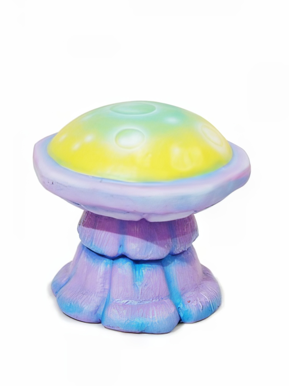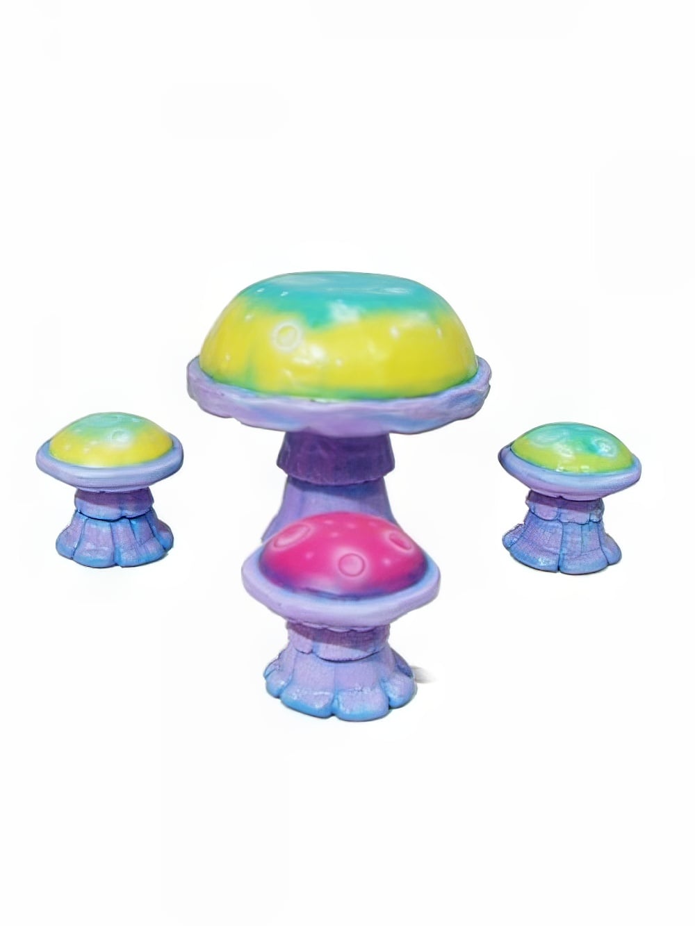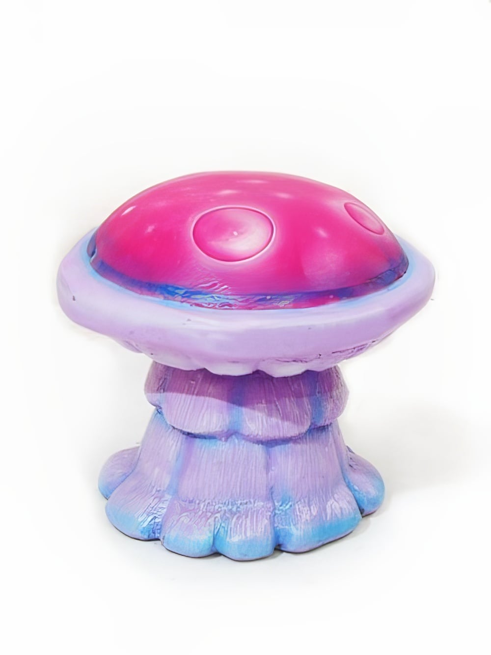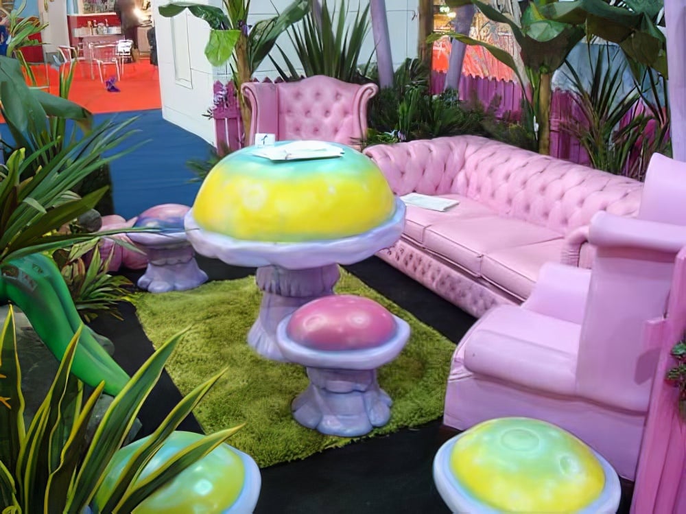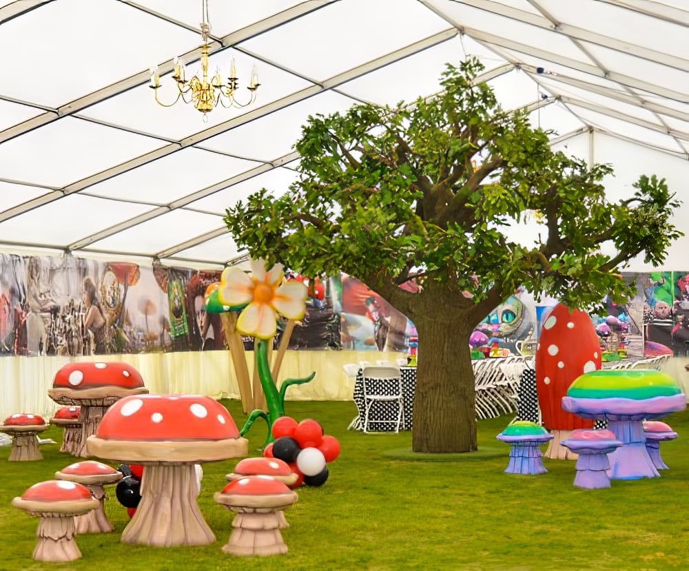 Toadstool Table & Stool Set for hire. This gorgeous set has been handcrafted by our talented team and consists of one table and four stools; perfect for your Alice in Wonderland themed event!
