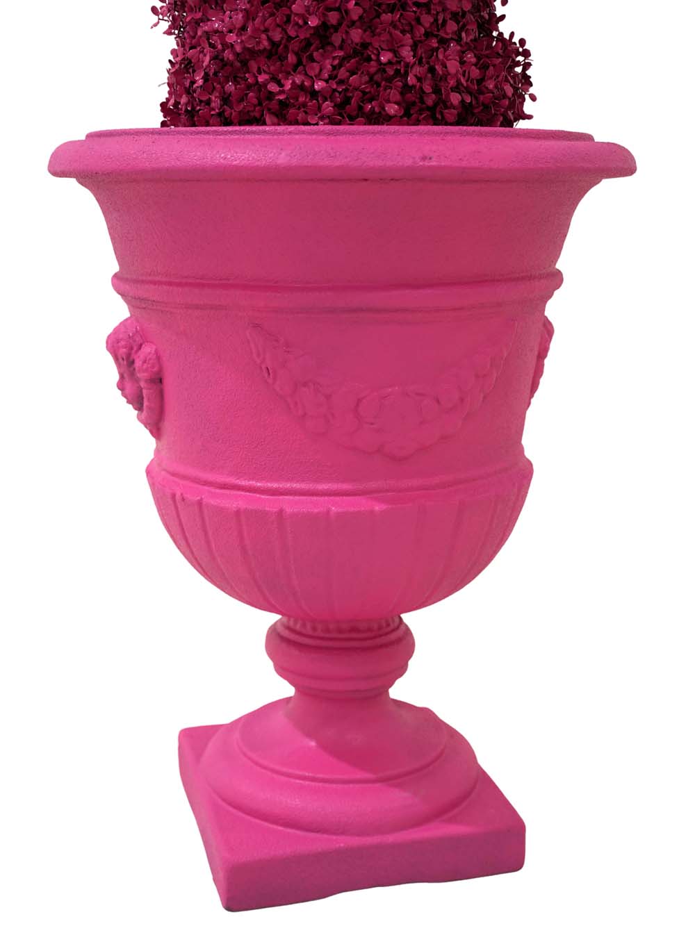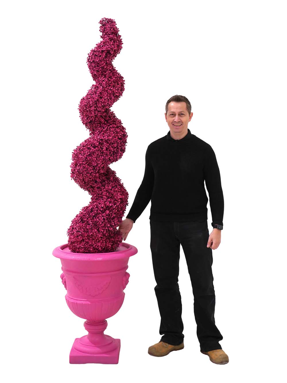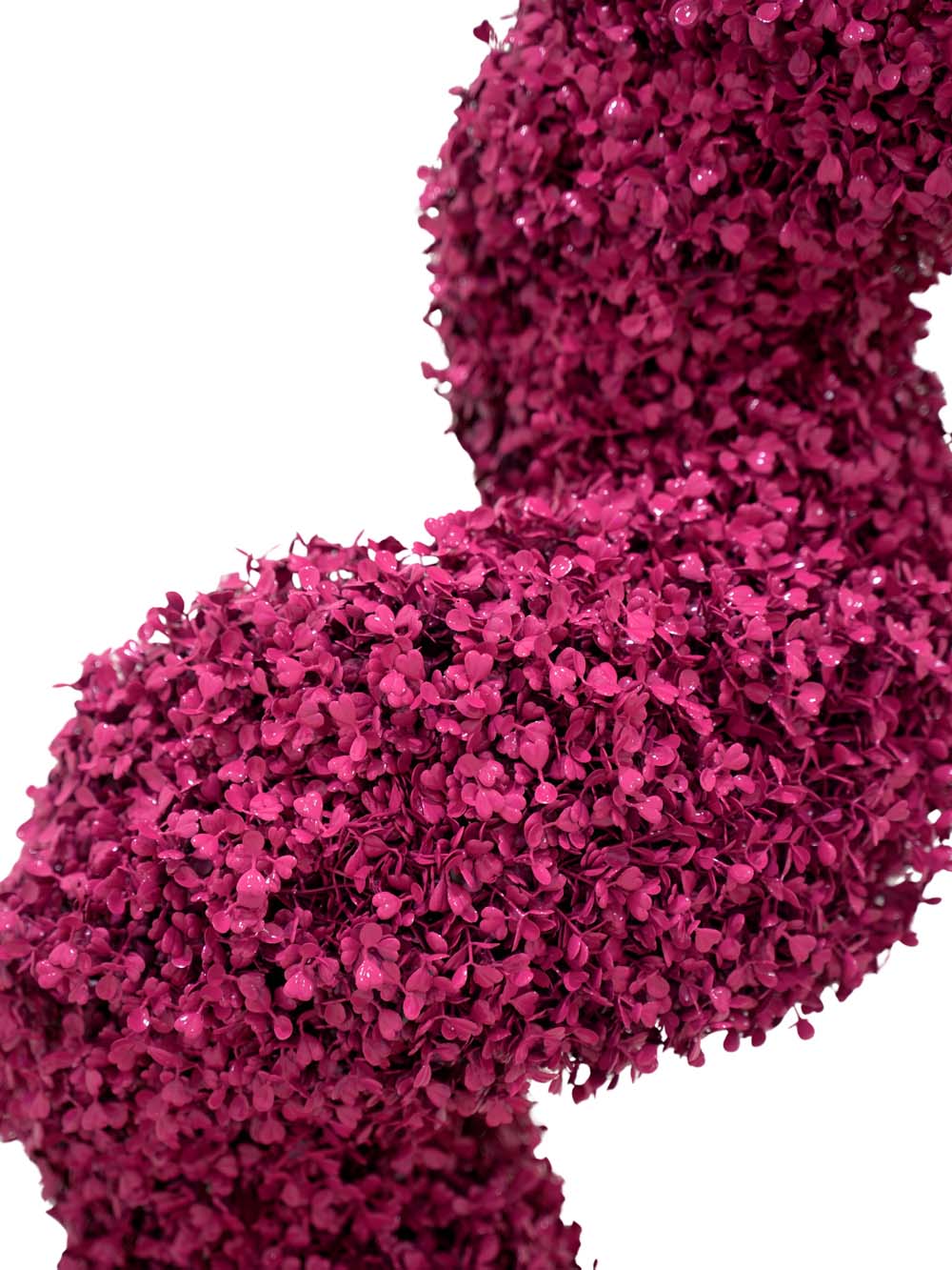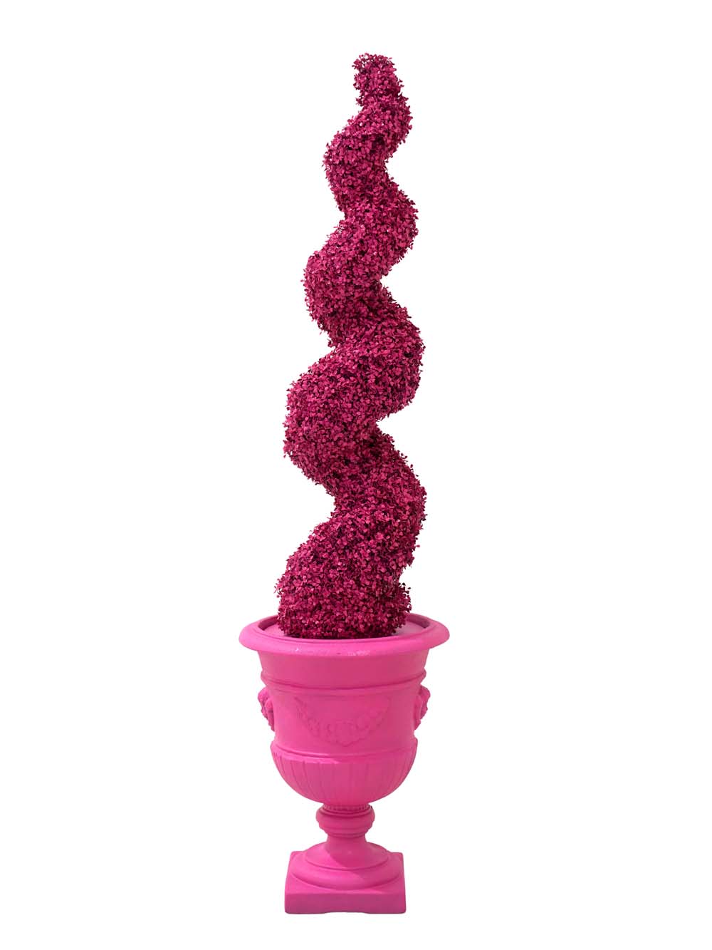 Luxury Topiary Twist ย– Pink to hire. Our range of multi-coloured spiral artificial topiary trees are suitable for any themed event or party night where you want bright colours. So if you want a crazy Alice in Wonderland theme party or Willy Wonka themed event or party, these crazy coloured artificial topiary trees will really make a difference!
