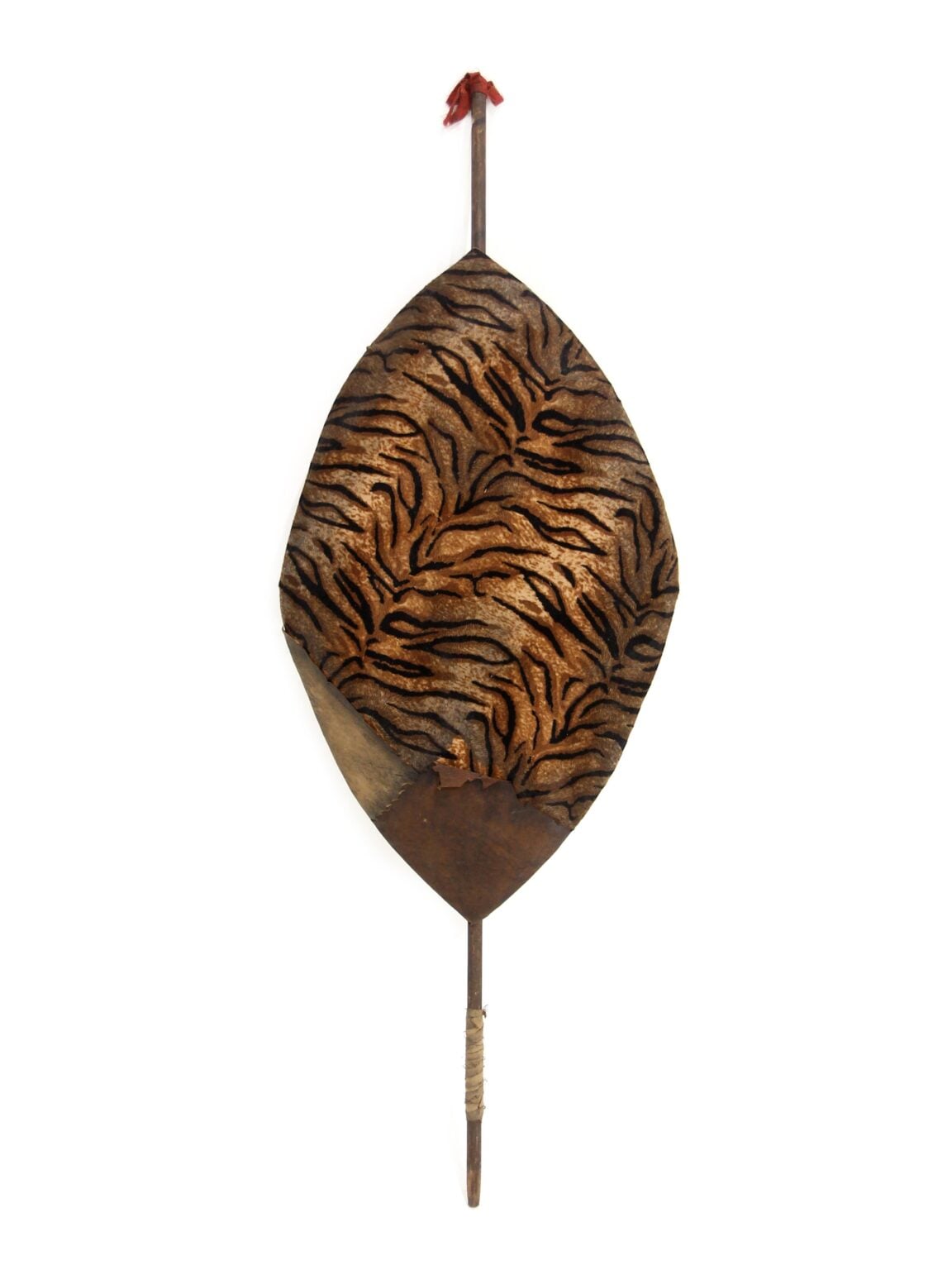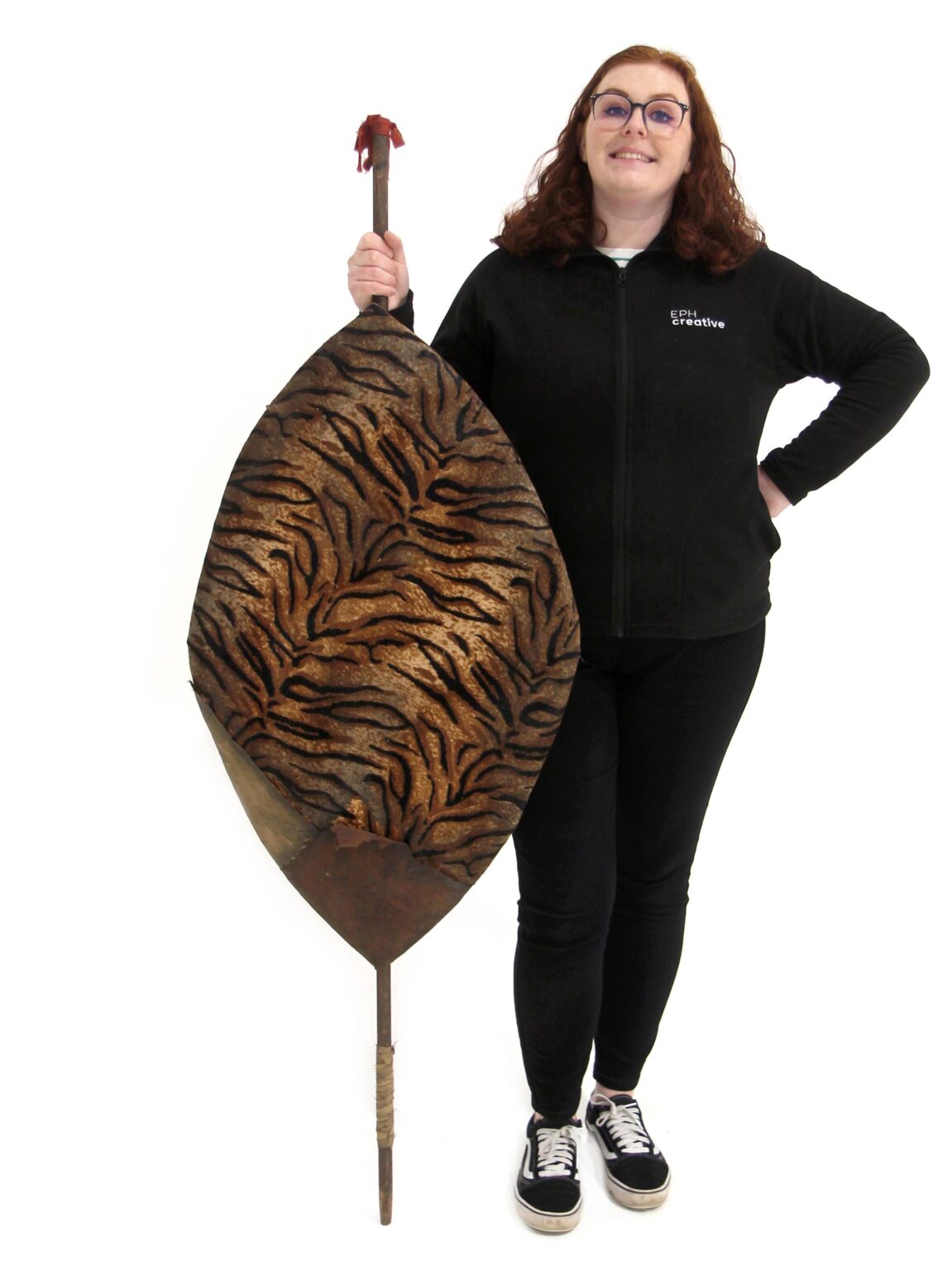 Medium Tribal Shield to hire. Covered in fake animal skins, these authentic looking shields are perfect prop hire for any African, Jungle or prehistoric themed event party. Why not hire our shields with some spears as well!
