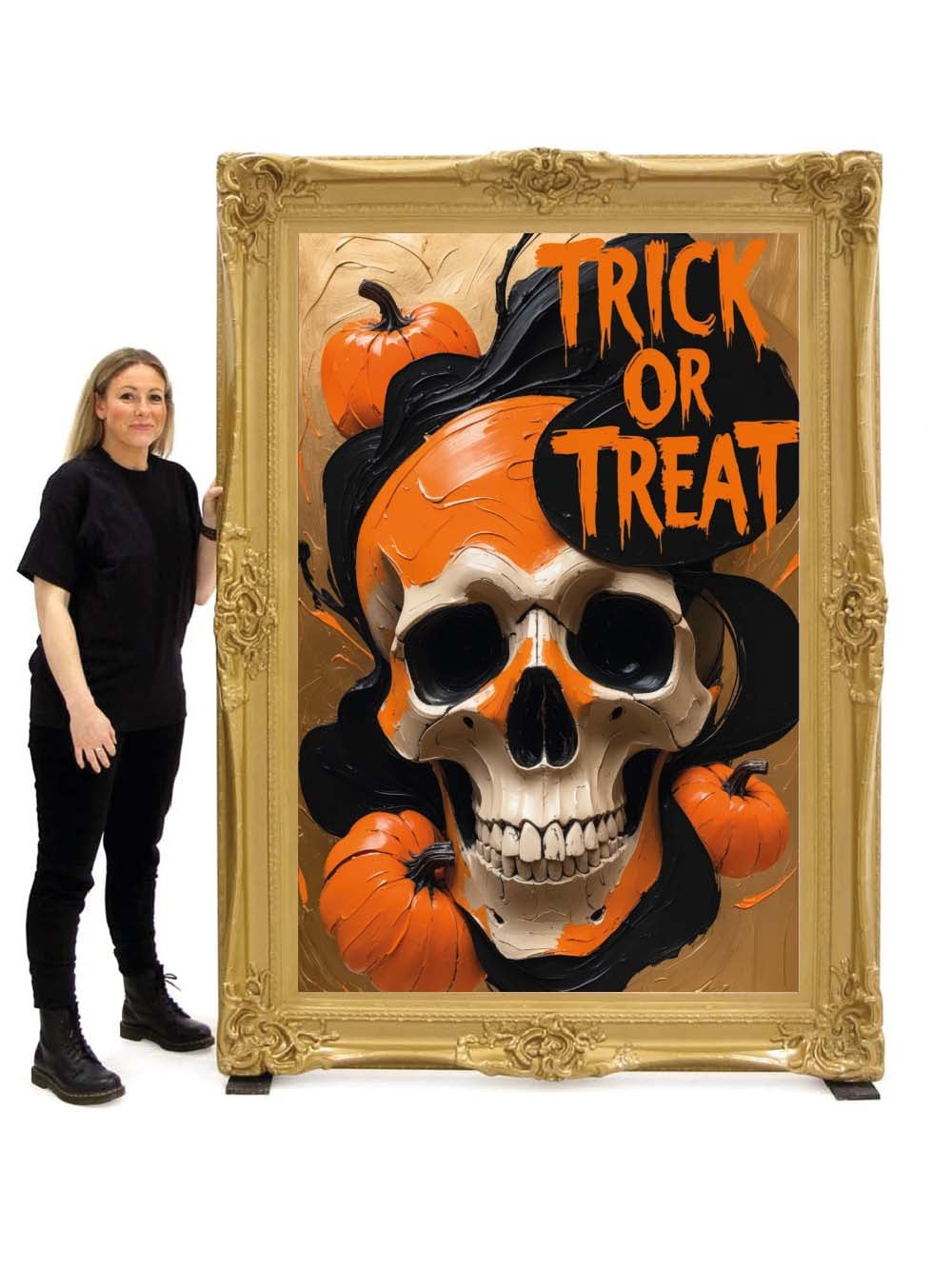 Trick or Treat Pumpkin and Skull Graphic in Gold Frame. Great theming for Halloween Themed events. Check out the full range of Halloween theme prints in giant frames.