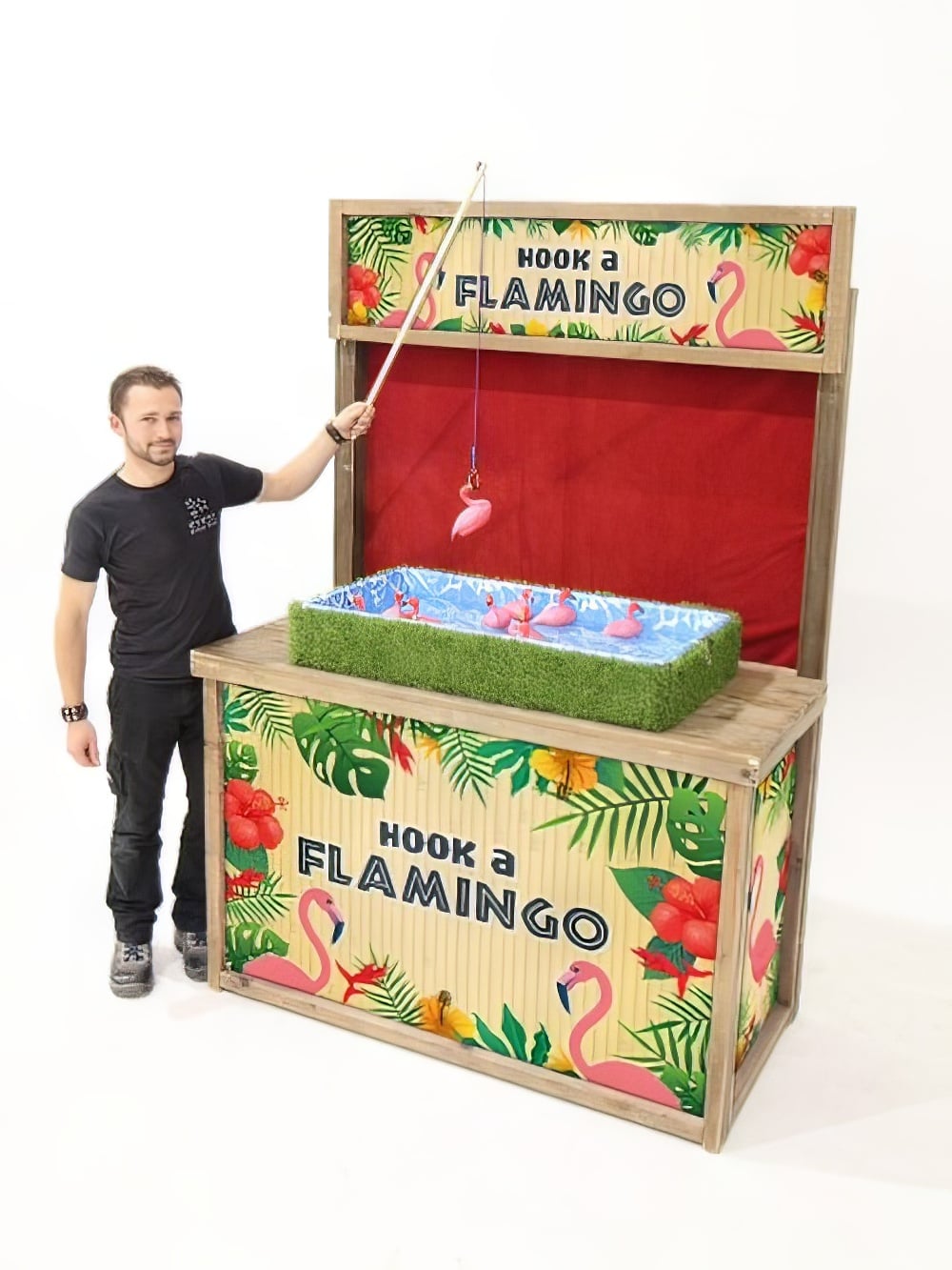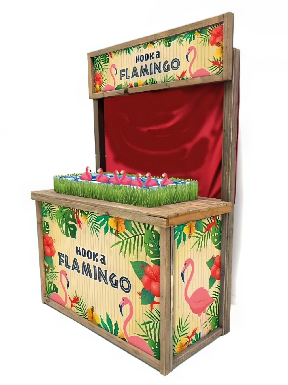 Tropical Hook a Flamingo Fairground Game for hire. Roll up roll up! Test your ‘fishing’ skills with our beautiful non-traditional Tropical Hook a Flamingo Fairground Game. Try to hook as many flamingos as you can with the supplied ‘fishing’ poles. Take a look at our full range of traditional Fairground Games here.