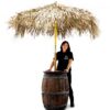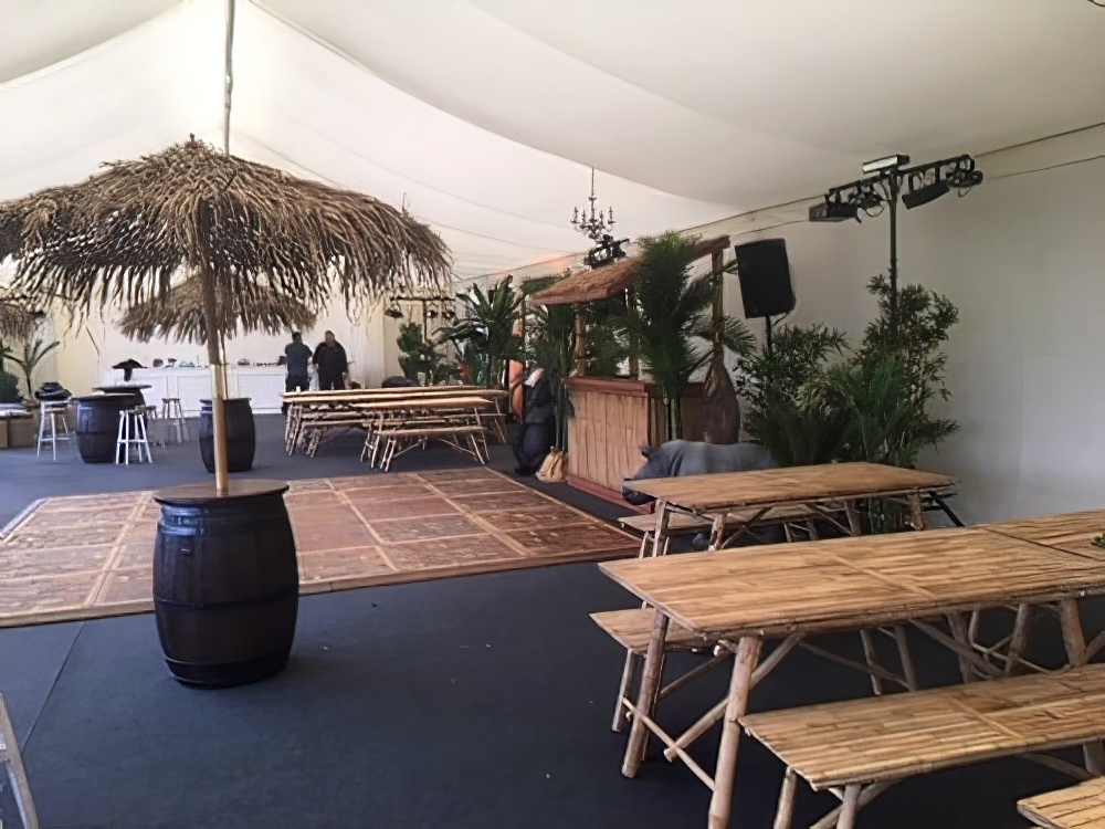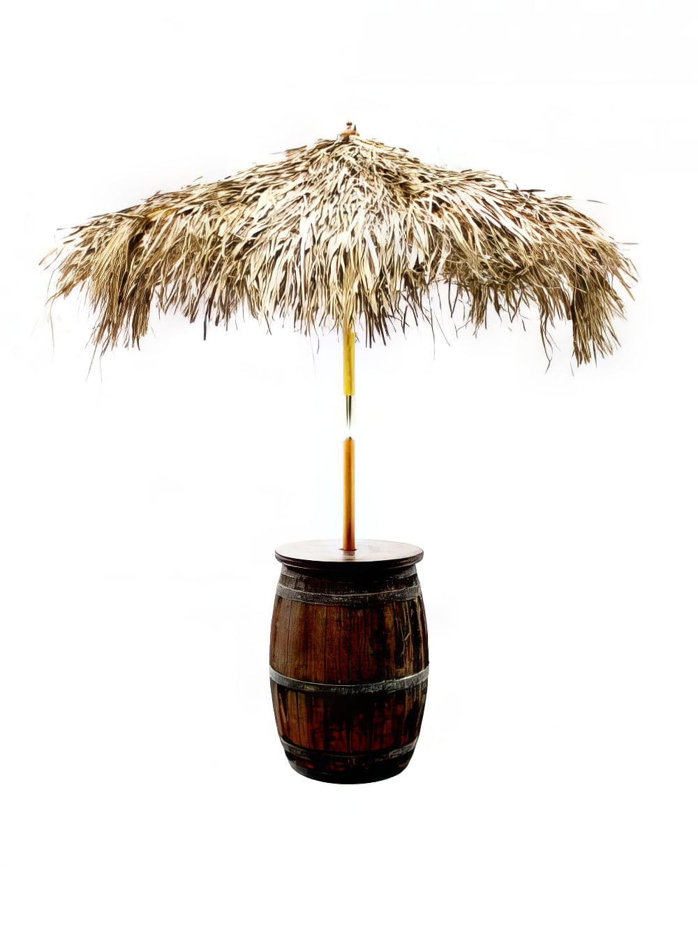 Tropical Poseur Table to hire with thatched effect roof/parasol. Imagine your guests at your party or event relaxing with cocktail in hand! This prop would be perfect for any African, Caribbean or Beach party.