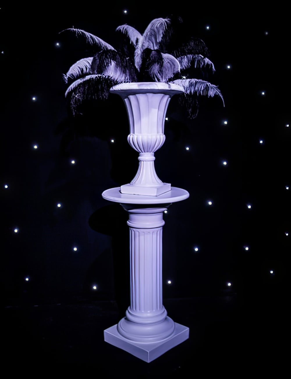 Urn with Black & White Feather Display for hire. This is a beautiful display of 24 feathers that would look great at any themed event. The feather display is also available in several black or white vase options ย (see below). The price quoted is for the urn with feathers only. For a small extra charge you can hire the plinth that the feather display is displayed with below. The price quoted is for the urn with feathers only. For a small extra charge you can hire the plinth that the feather display is displayed with below.