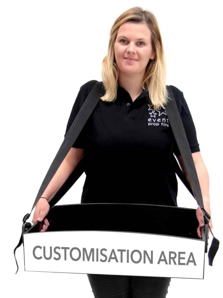 Black Usherette Tray to hire. Perfect for any number of event themes, this usherette serving tray is comfortable, lightweight, has handles, adjustable straps and a crossover back strap to make the serving of items easy & efficient.