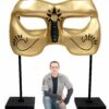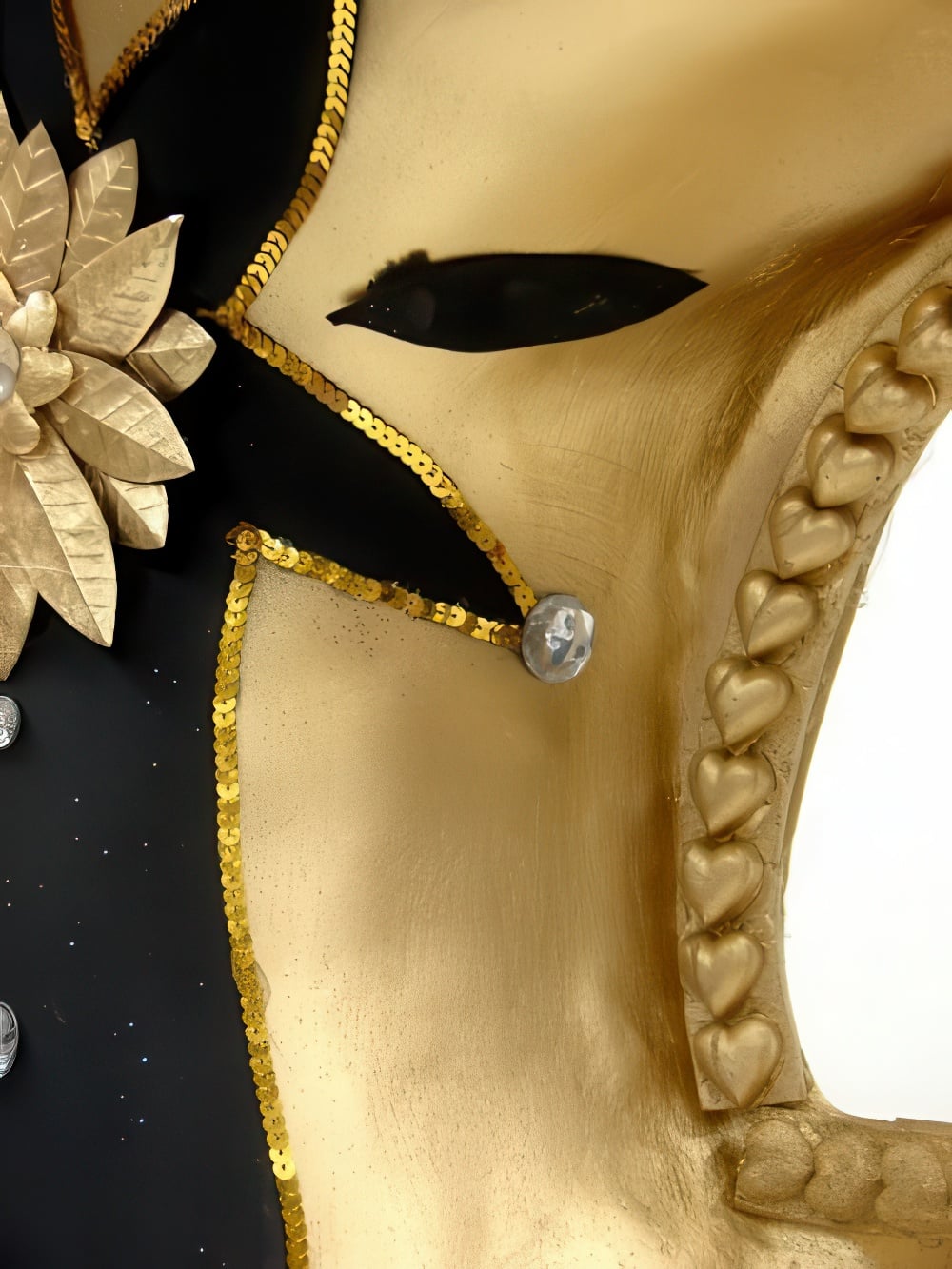 Venetian Gold Eye Mask to hire. This fantastically detailed mask is perfect prop hire for any Venetian ย  or masked ball themed event and is freestanding.