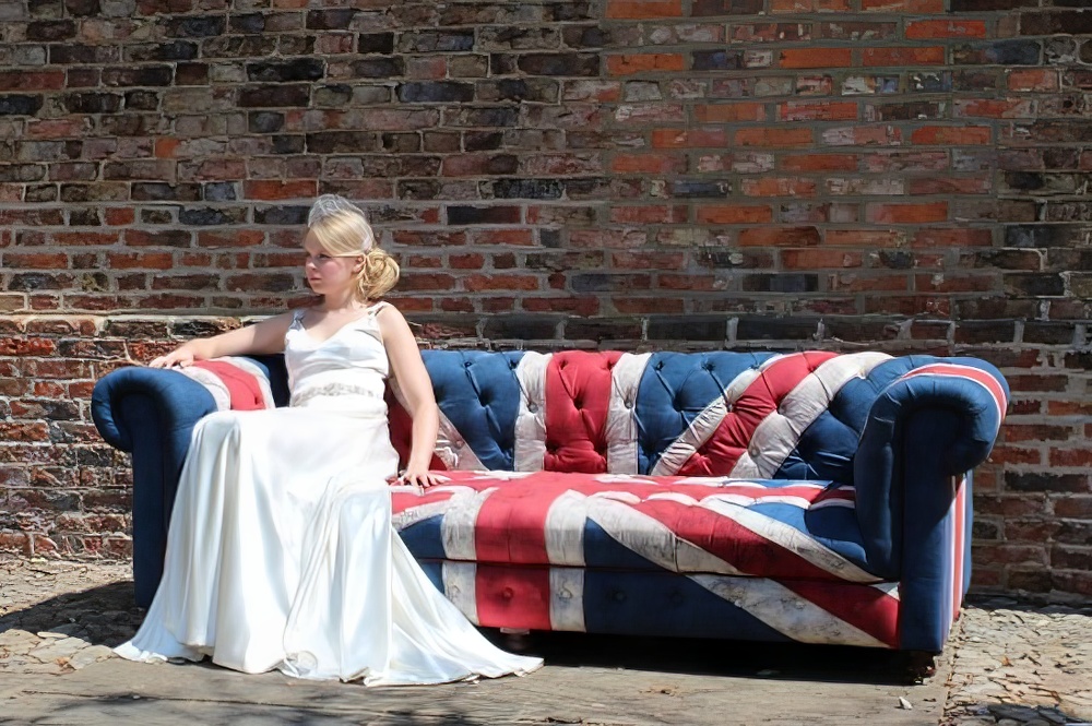 This Vintage Union Jack sofa to hire would be perfect for any British themed event or party! Upholstered in a ย retro shabby chic Union Jack ย fabric, this eclectic chesterfield sofa makes a dramatic statement and brilliant photo opportunity at your themed event! ย  ย It’s part of a themed set including an armchair & bench (see below).