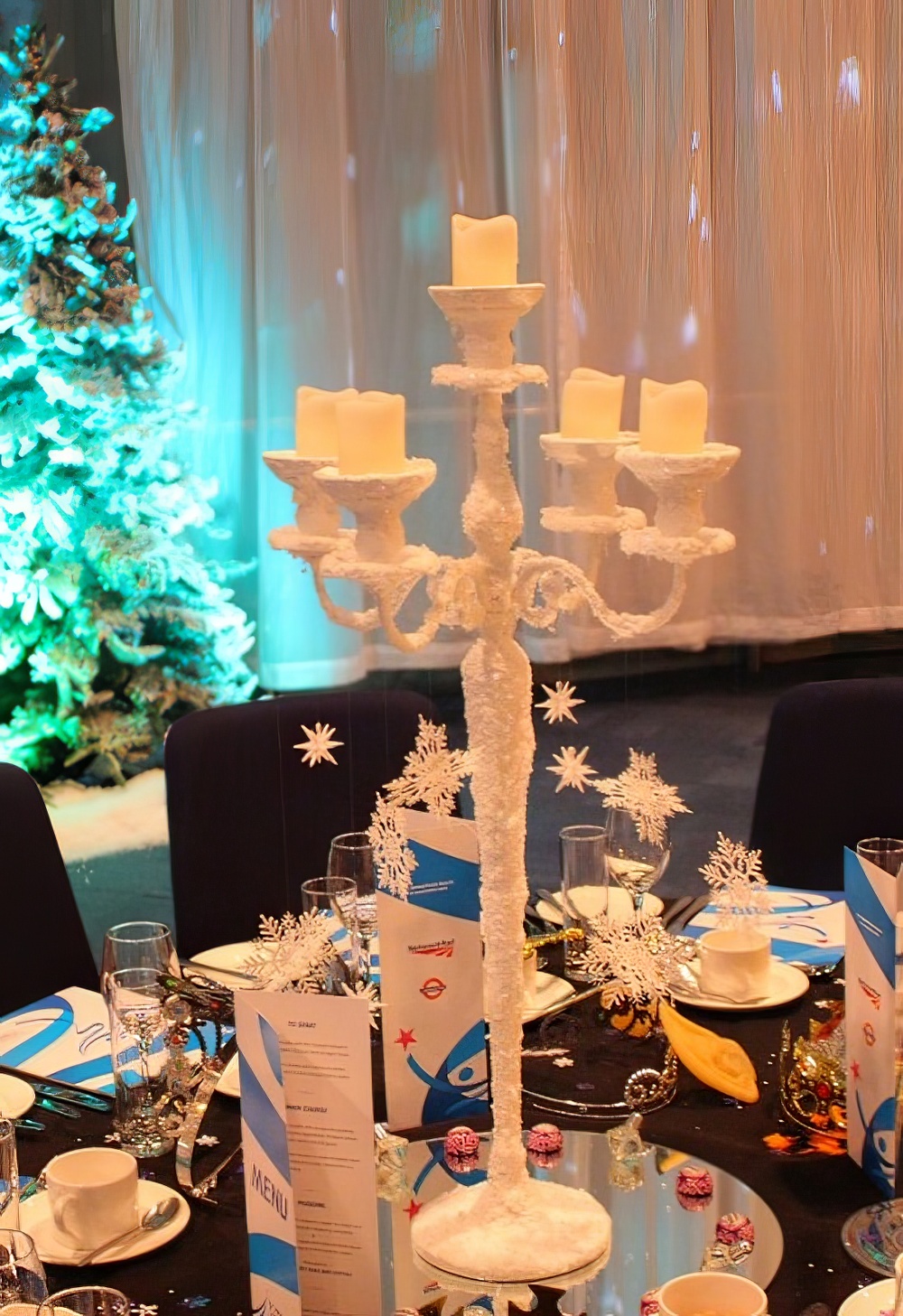 White Candelabra for hire. This candelabra has five arms and will look great at all manner of events, from a wedding to a Christmas or Winter themed event.