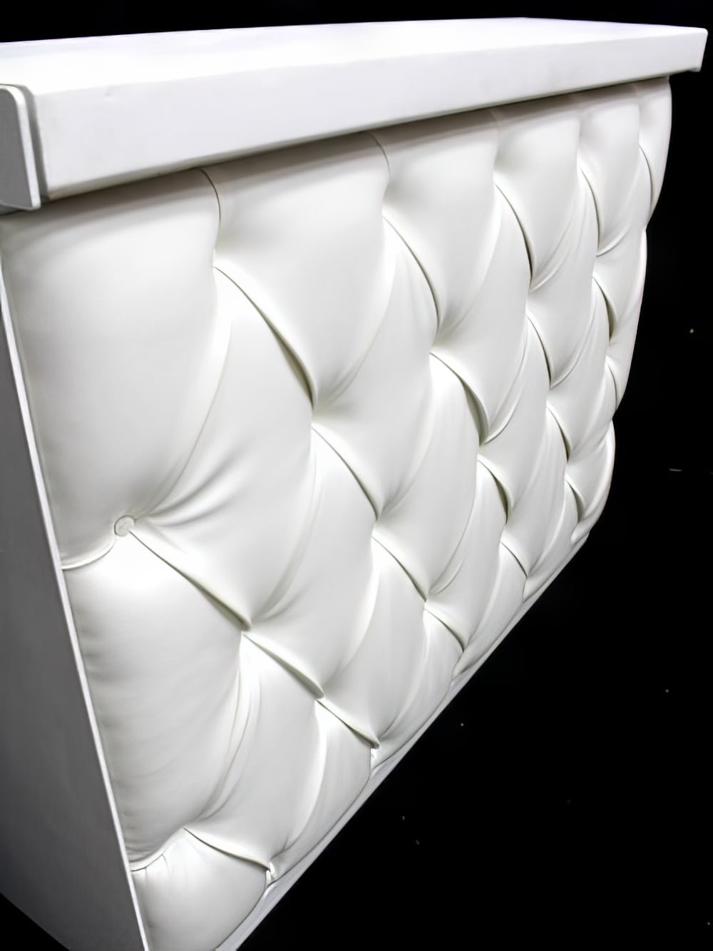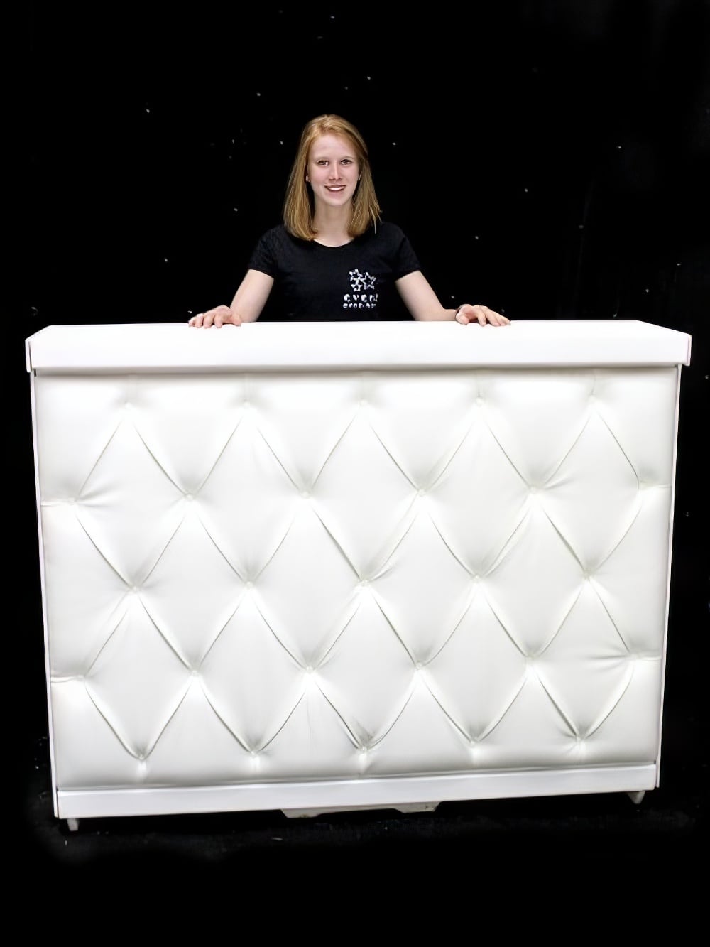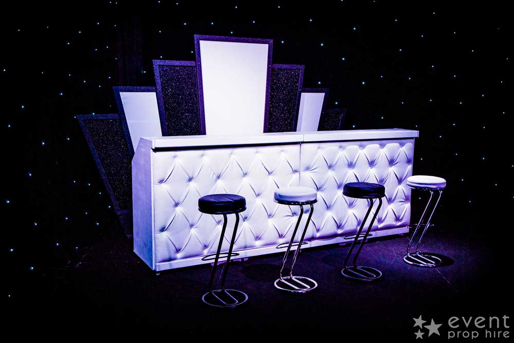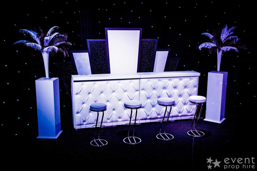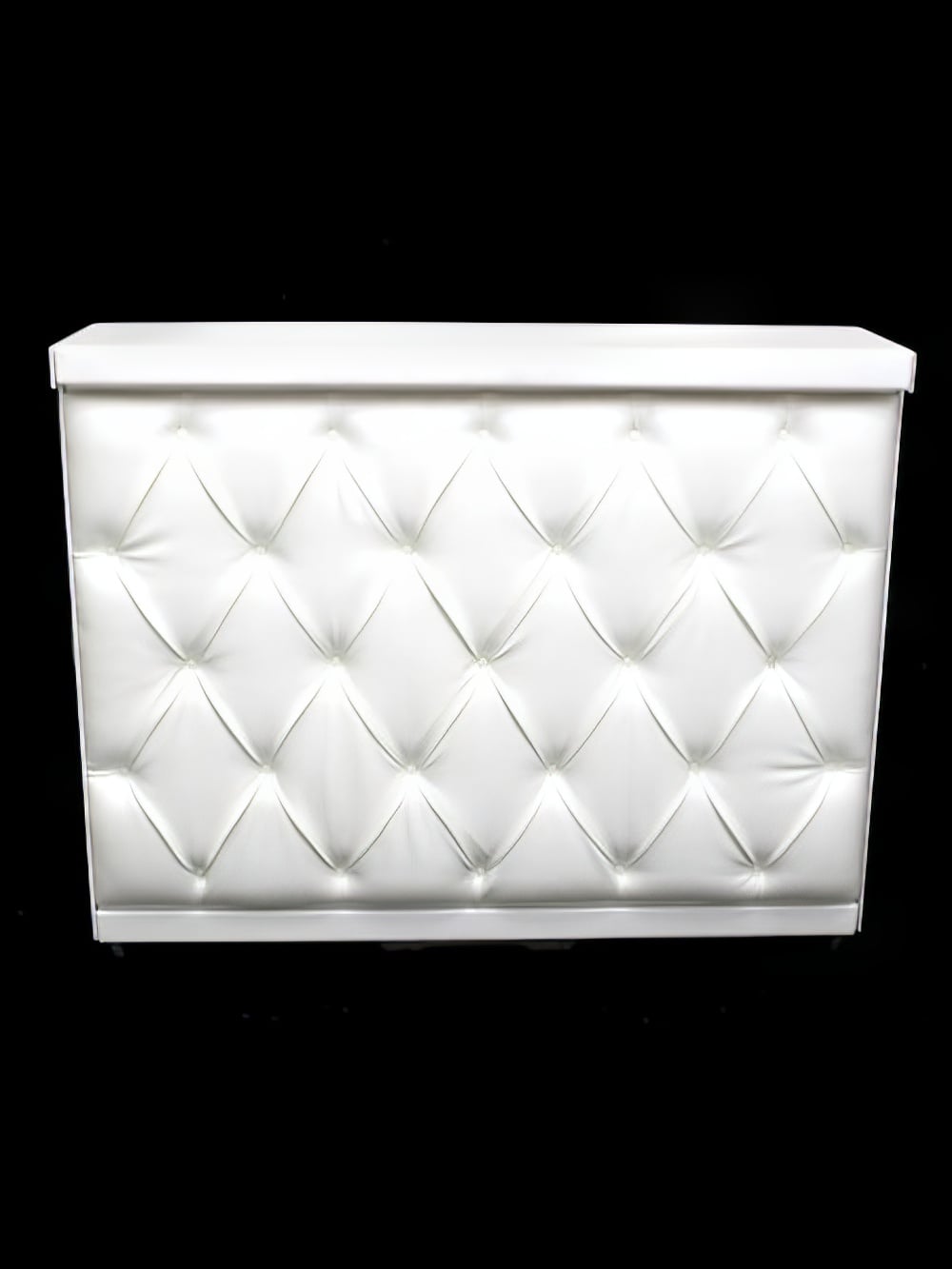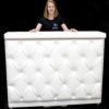 White Chesterfield Bar for hire. This white Chesterfield bar is upholstered in white leather effect vinyl and is a great item for all manner of themed events and parties. So whether you are creating a winter look for your event, or simply want a sophisticated bar from which to serve your guests, then this is the bar for you! We have lots of white Chesterfield furniture items that would complement this bar perfectly. Take a look at some below. The price quoted is for a 1.5m bar but but we can also supply this as a 3m and 4.5m length bar too.