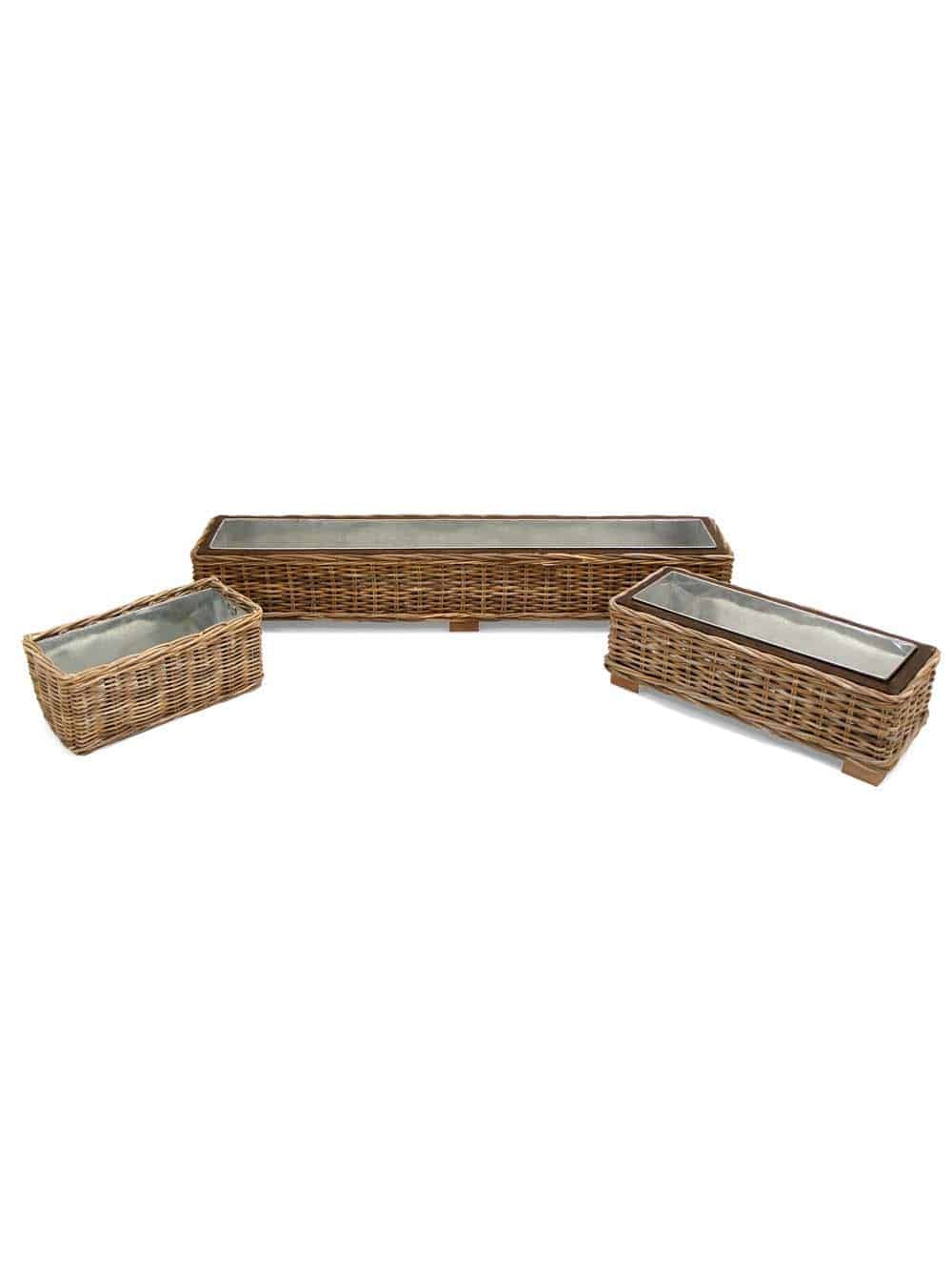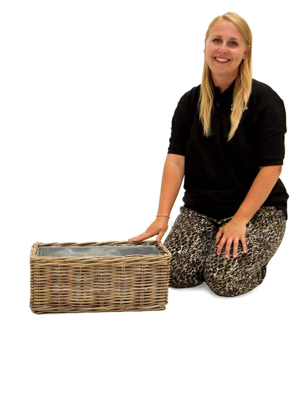 Wicker Basket With Zinc Planter for hire. These rectangular baskets have a internal zinc lining and can be used for holding plants or other props.
