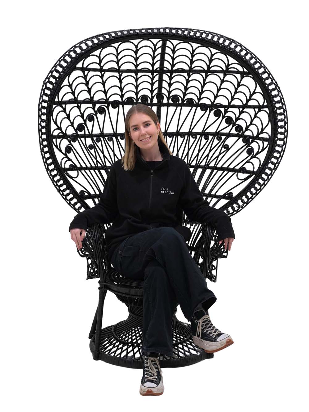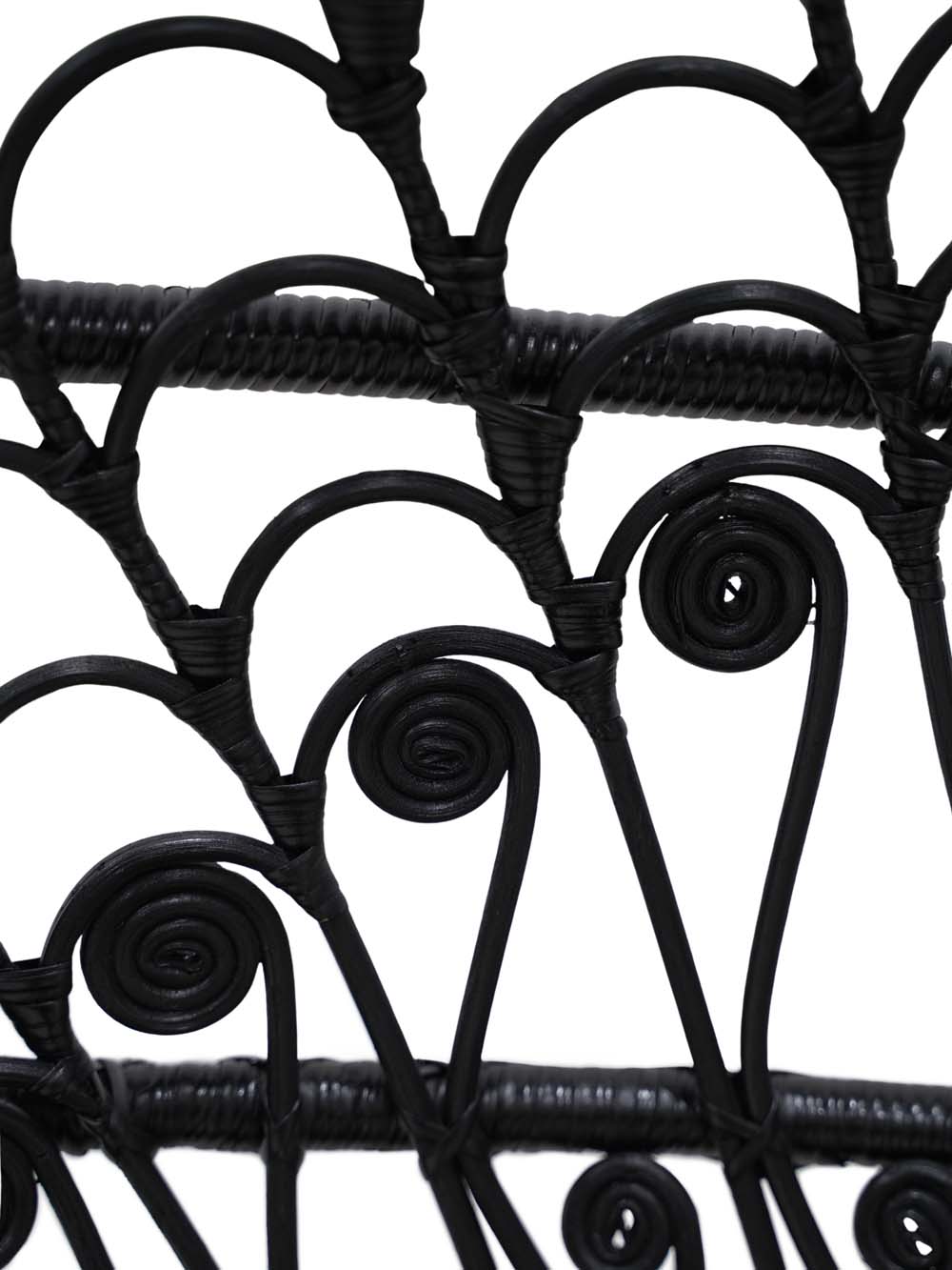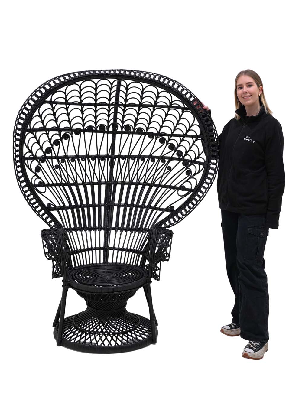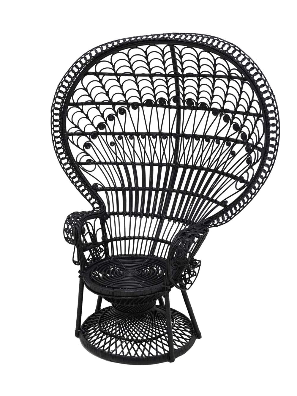 Wicker Peacock Chair – Black for hire This stylish chair, an iconic design from the sixties and seventies, is made in quality natural rattan, painted black. This distinctive chair is perfect for seating at your event, whether to style a rich velvet look or an Addams Family garden party. Exuding glamour and a retro vibe, the peacock chair is the perfect piece to complete your theme and provide the perfect spot for Instagram photos.
