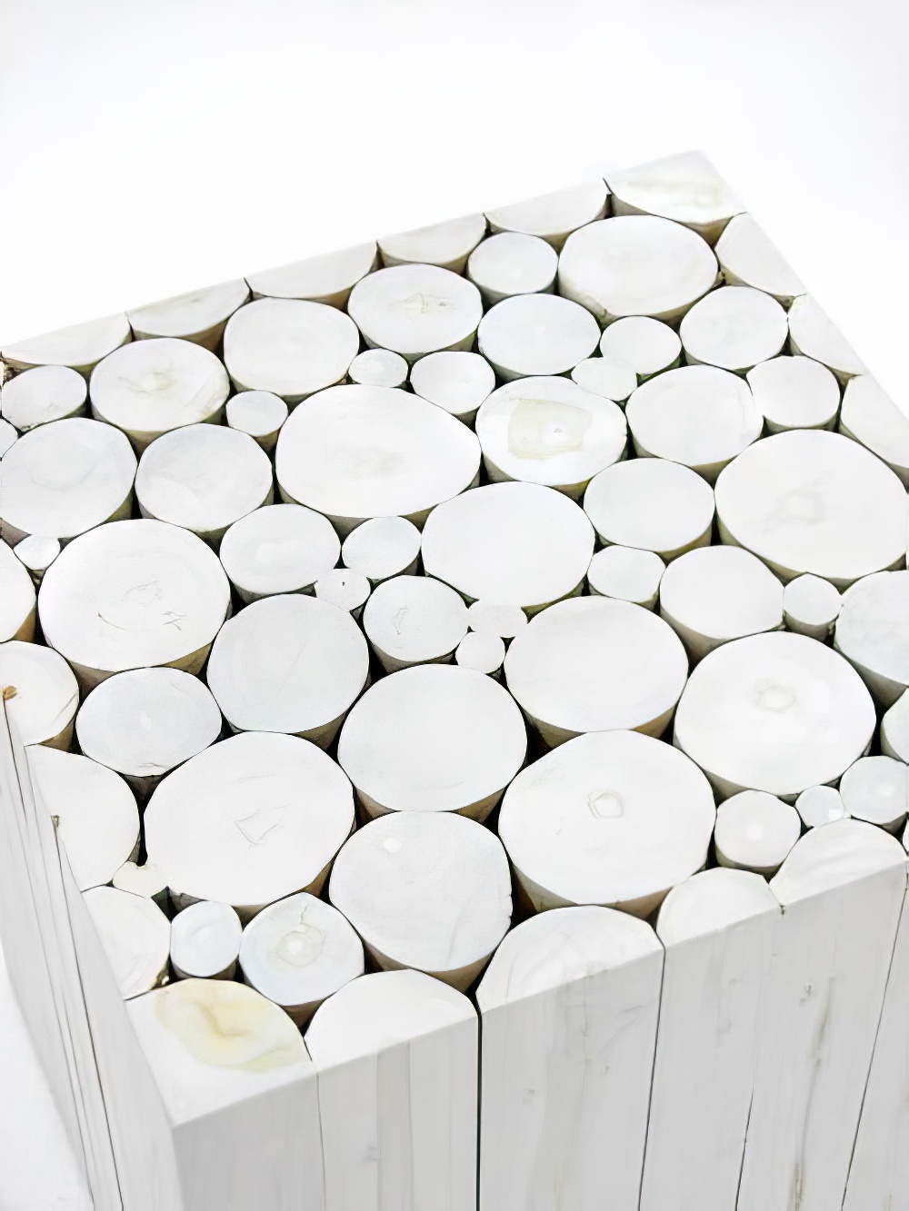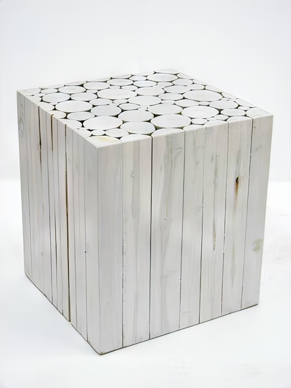 Wood Cube Table furniture to hire. This stylish solid wood table is constructed from a number of vertically orientated logs of differing sizes and stained in a sleek white to give a simple yet elegant furniture solution.