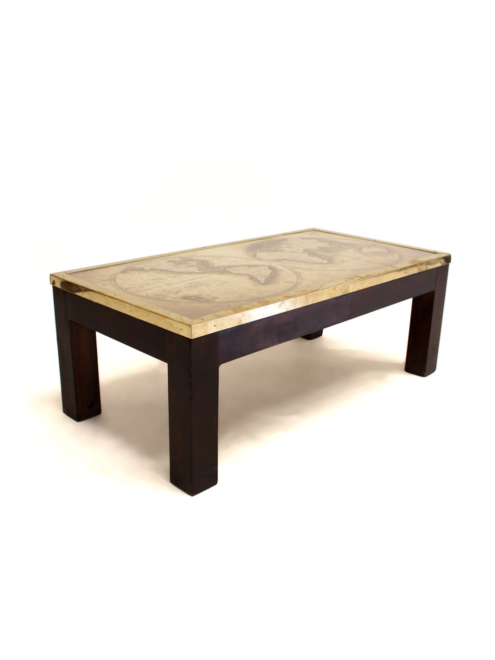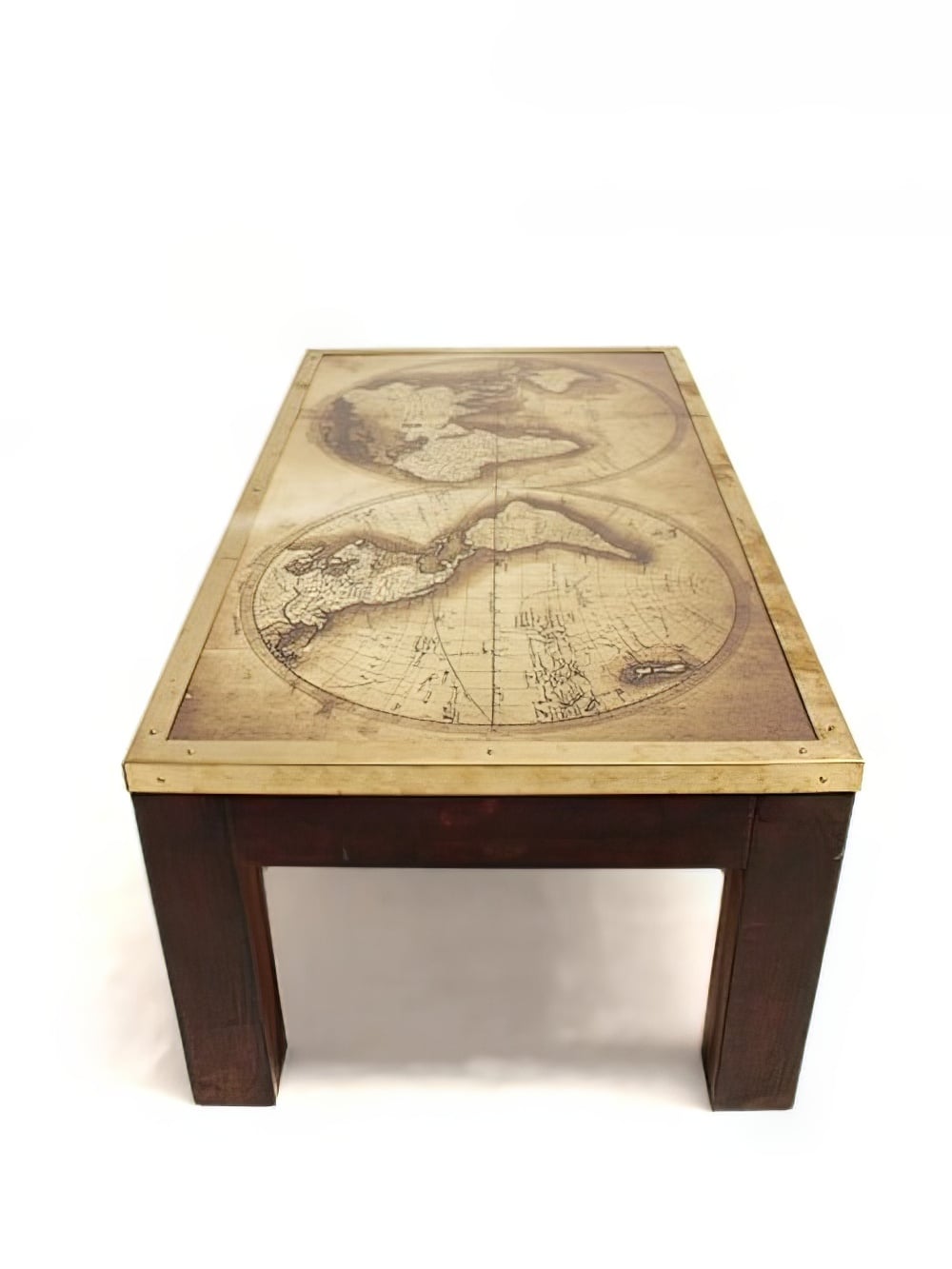 Wooden Coffee Table with Antique Map to hire. A lovely wooden table complete with an antique style map of the World.