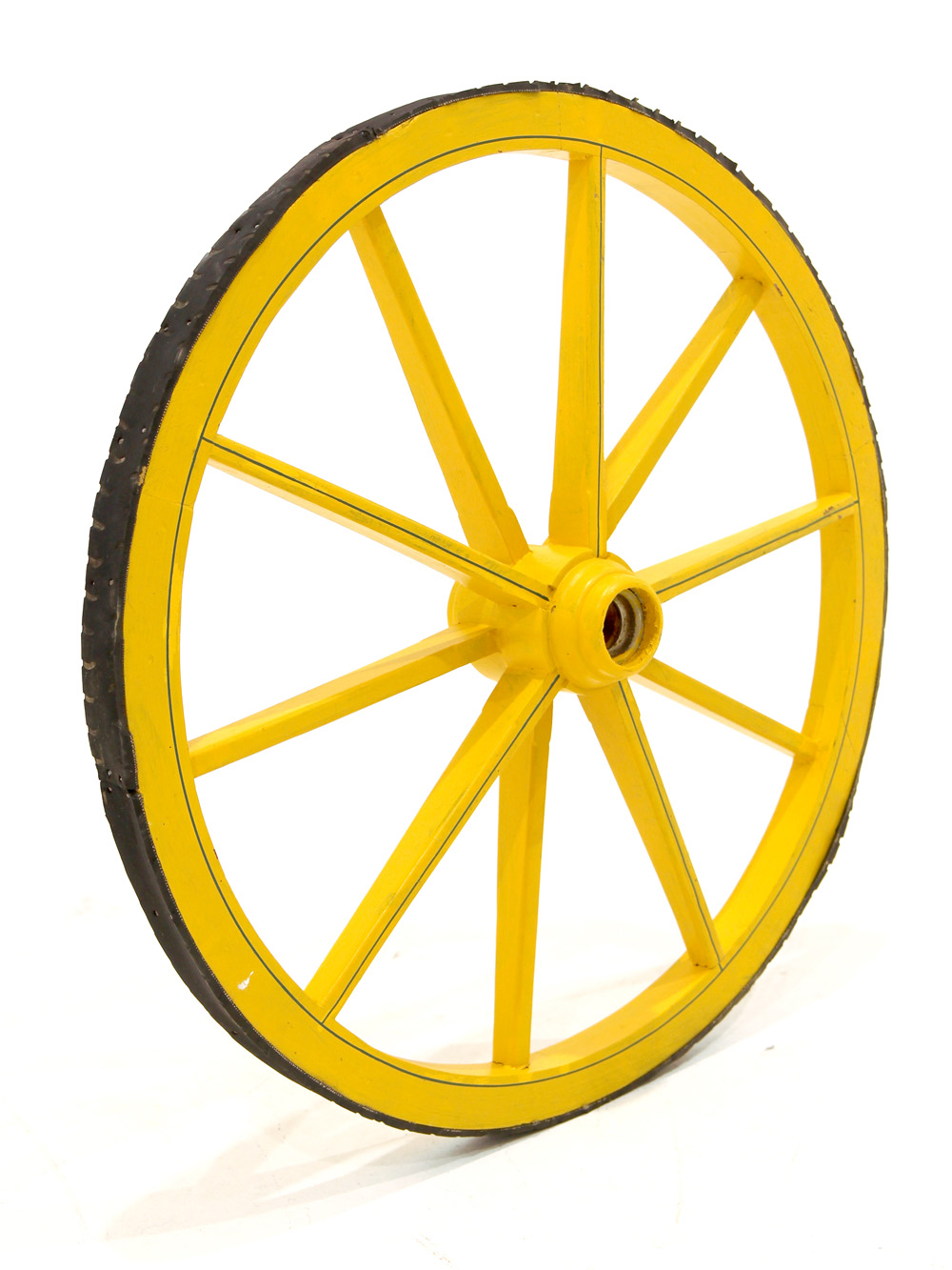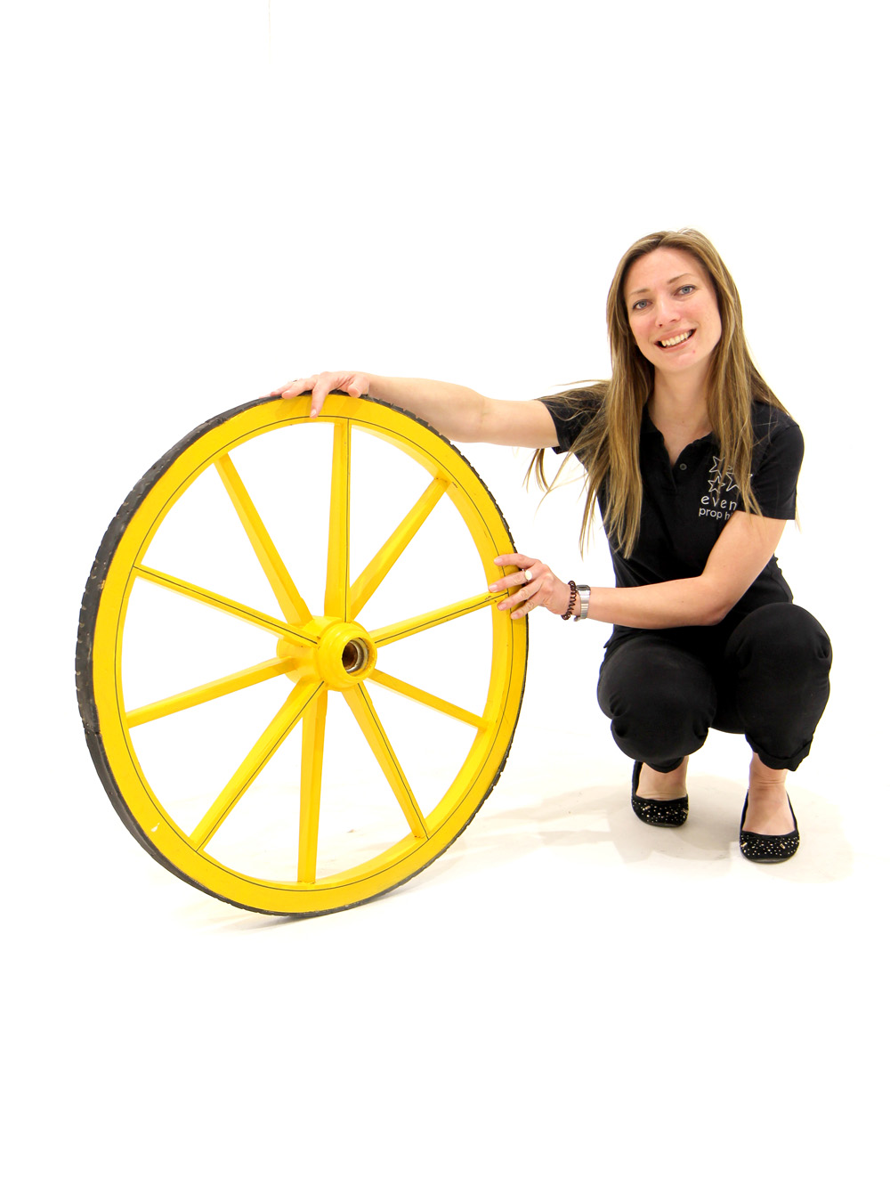 Yellow Cart Wheel for hire. This Yellow Cart Wheel is an ideal dressing item for any vintage Circus themed event. Prop this Yellow Cart Wheel up against our Fabric Straw Bale, Strongman Mallet and some Vintage Travel Luggage to create the perfect travelling vintage Circus montage. Please note our Yellow Cart Wheel is not freestanding so will need to be propped or placed against something to stand upright. Please note our Yellow Cart Wheel is not freestanding so will need to be propped or placed against something to stand upright.