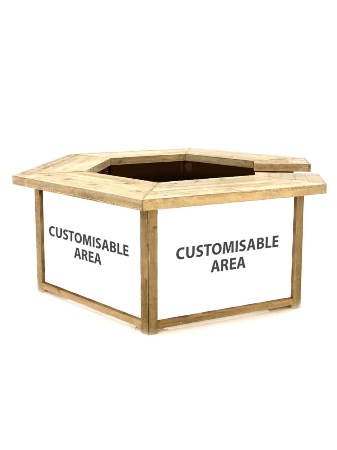 Customised Rustic Wooden Hexagon Bar / Food Stall for hire with custom printed front panels.