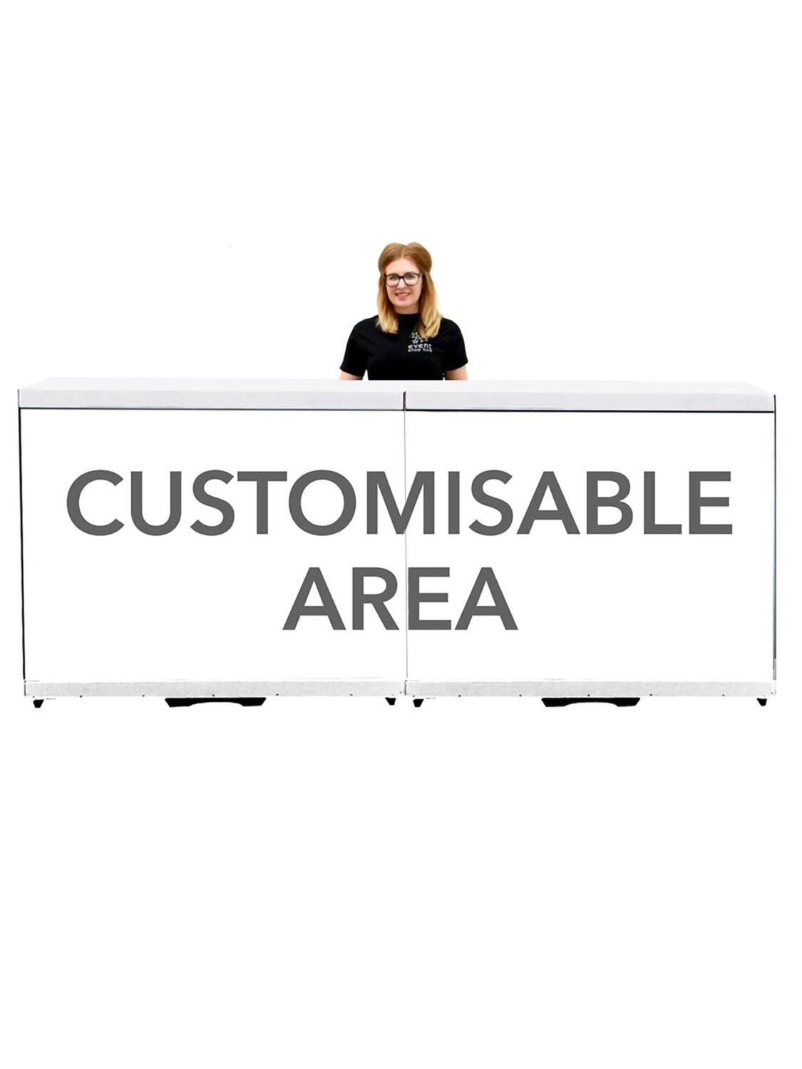 We have a highly skilled team of graphic designers who can help you with the customisation of our 3m long white drinks bar.