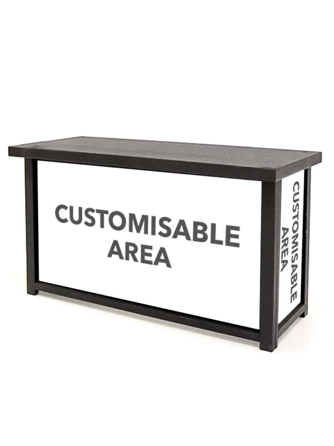 We sill supply you with a custom printed panel on 2mm thick foamed board that slots into the front of the stall. The black frame of the stall provides a versatile base that suits most themes and colour schemes. It also works well as a drinks bar.
