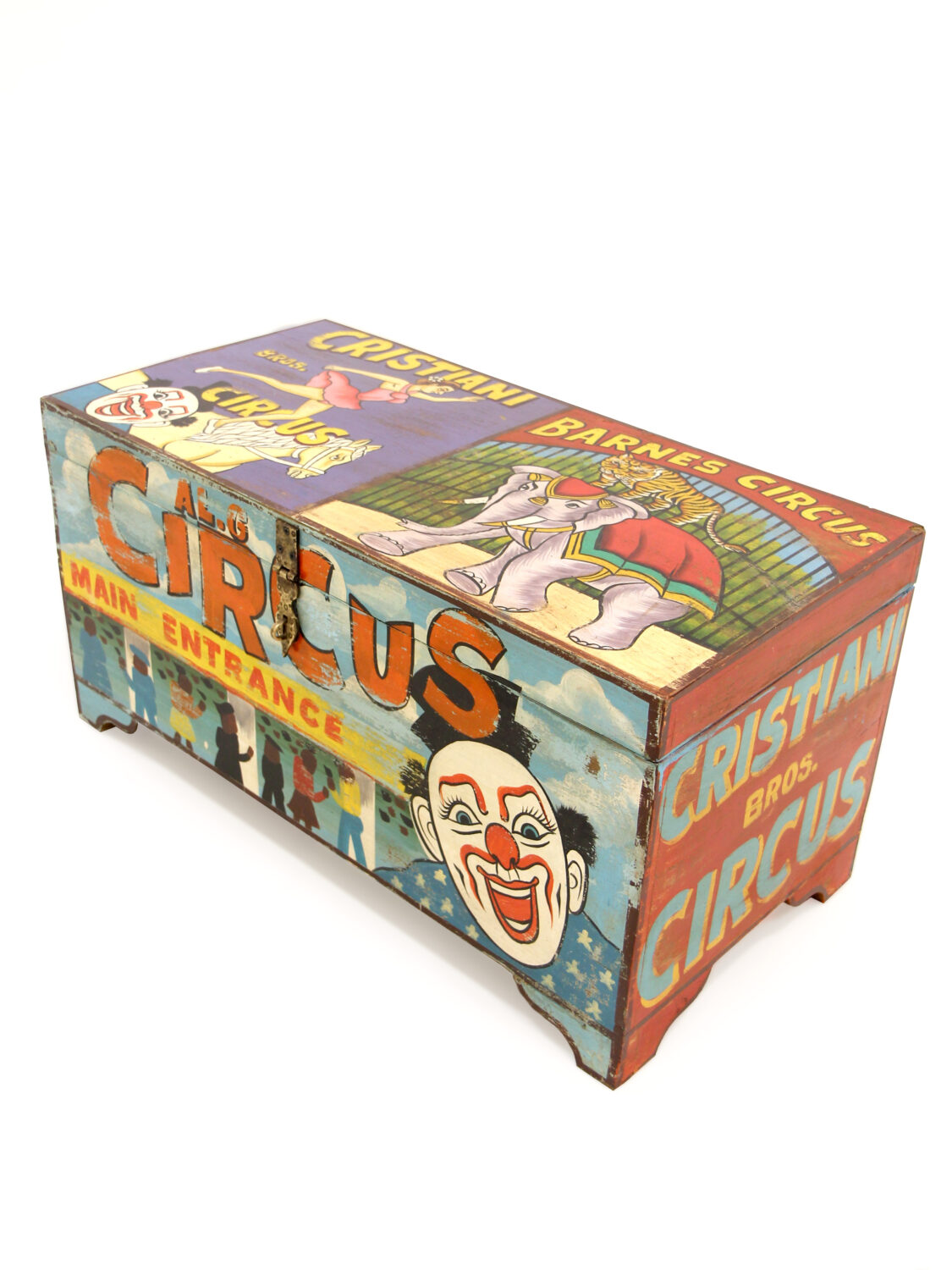Vintage looking wooden circus trunk with vintage artwork and paint.