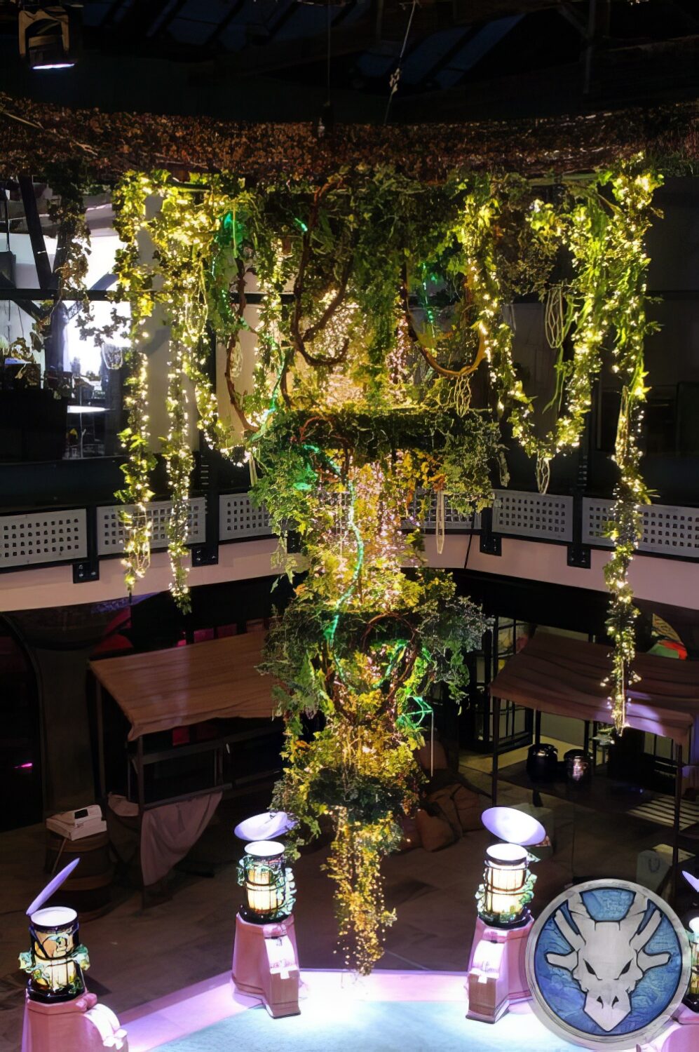 This is a stunning, not to mention very large, chandelier that will look amazing at your event. The chandelier is lit with warm white LEDÃ ¢ s and is covered in trailing ivy and jungle vines.