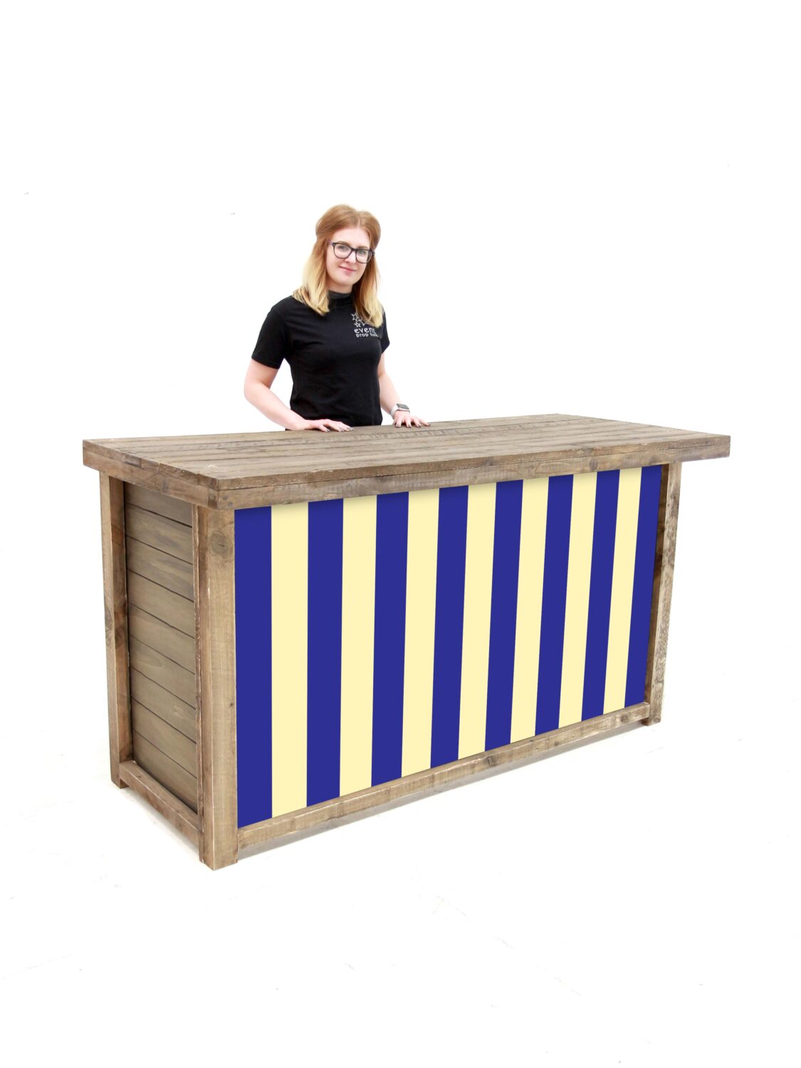 Blue and Yellow Striped Customisable Food Stall to hire.