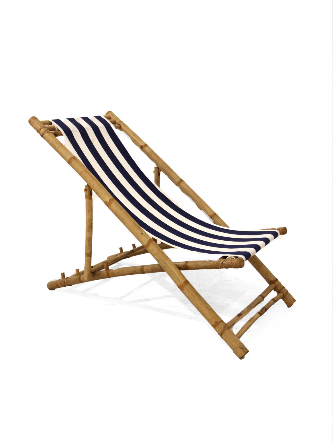 Bamboo Deckchair Deck Chair in navy blue stripe to hire.